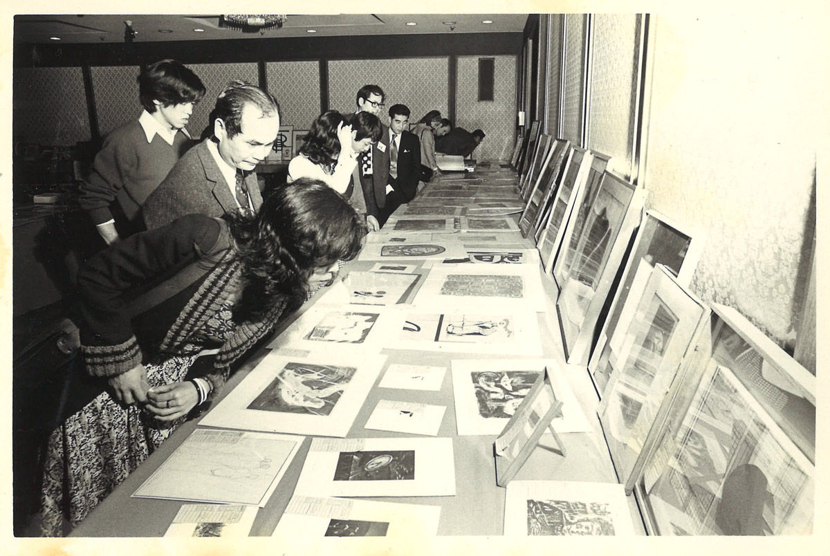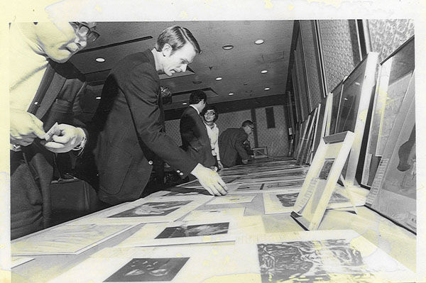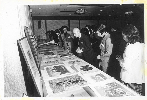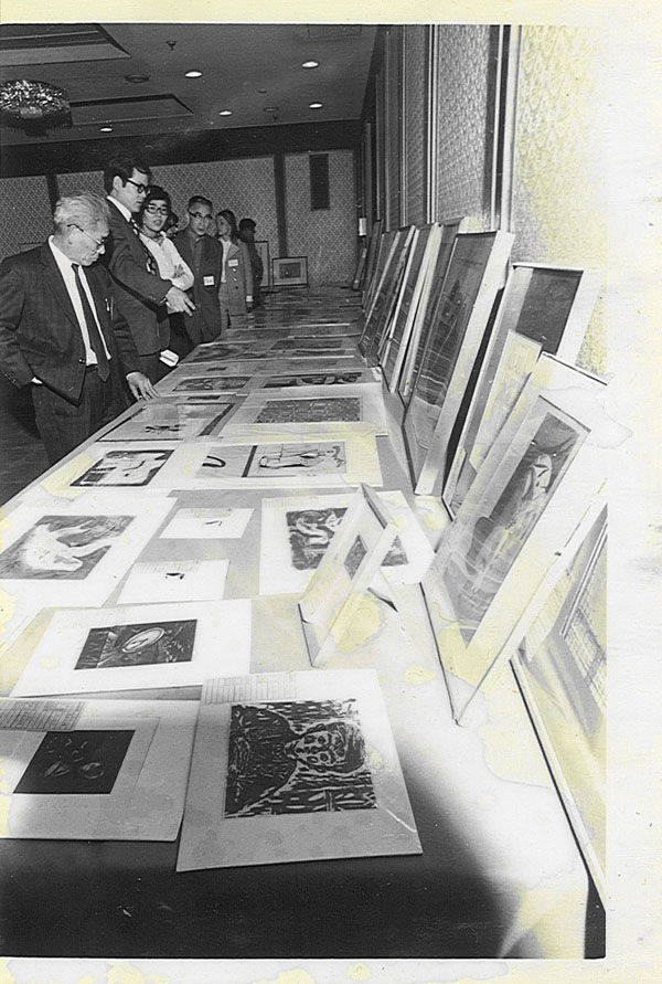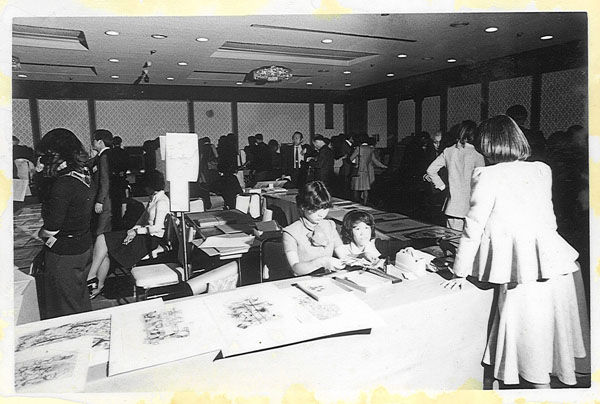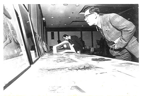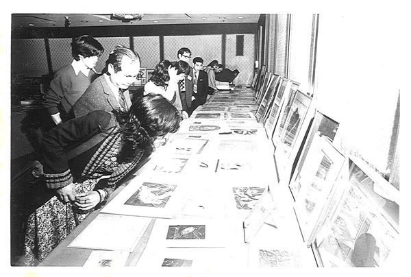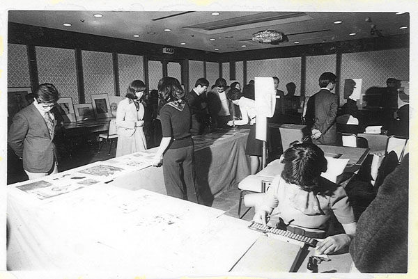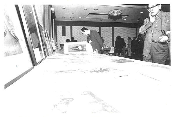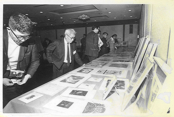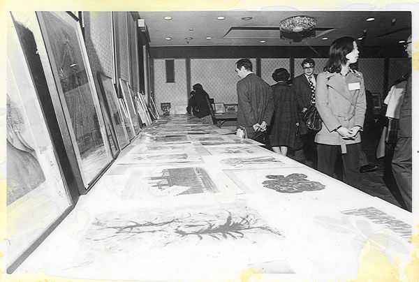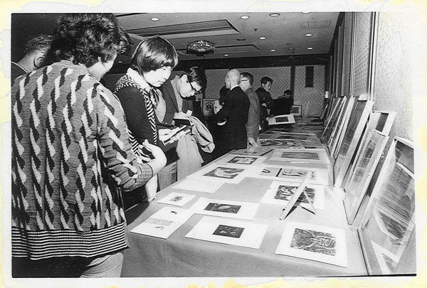 私が、時々おどろく程大きなカバンをさげて歩いているのを御覧になったことがございましたでしょう。あの中には今の日本では代表的な画家の版画がはいっていたのです。と申しますのは、私の先生が、美術の鑑賞は、ことばで説明してはいけない。本当に芸術性の高い作品にじかに接する機会を与えることだと教えられたことを忠実に守って、いつでも誰でもそれを見たい人があったら展げて見せられるように常に持って歩いていたわけです。だから、皆さんには誰よりも見ていただきたい気持ちは、やまやまでしたけれども、さすがに教師の身分を利用して絵を売るように思われることに気おくれしてお見せすることができませんでした。ところが、このたび毎日新聞の方が、私が二十年間続けてきたこの運動を高く評価して一緒に協力してくれることになり同封のような立派なパンフレットを作ってくれました。又五百円の会費でオークションの会場を提供してくれました。それでやっと私は自信をもって皆様に会員になり、オークションに参加して、親しくこれらの版画を見たり買ったりすることをおすすめできる次第です。