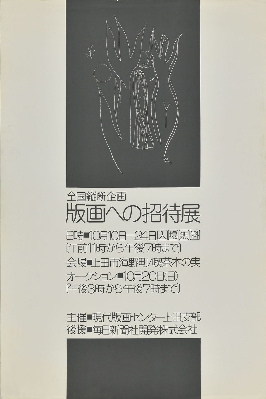 1974.10.10 現代版画センターの記録 全国縦断企画「版画への招待展」上田展 全国縦断企画「版画への招待展」上田展 会期:1974年10月10日~24日 会場:長野県上田市海野町・喫茶木の実 主催:現代版画センター上田支部 後援:毎日新聞開発㈱ ●1974年10月長野県上田市喫茶木の実「全国縦断 版画への招待展」ポスター(シルク刷り:石田了一)