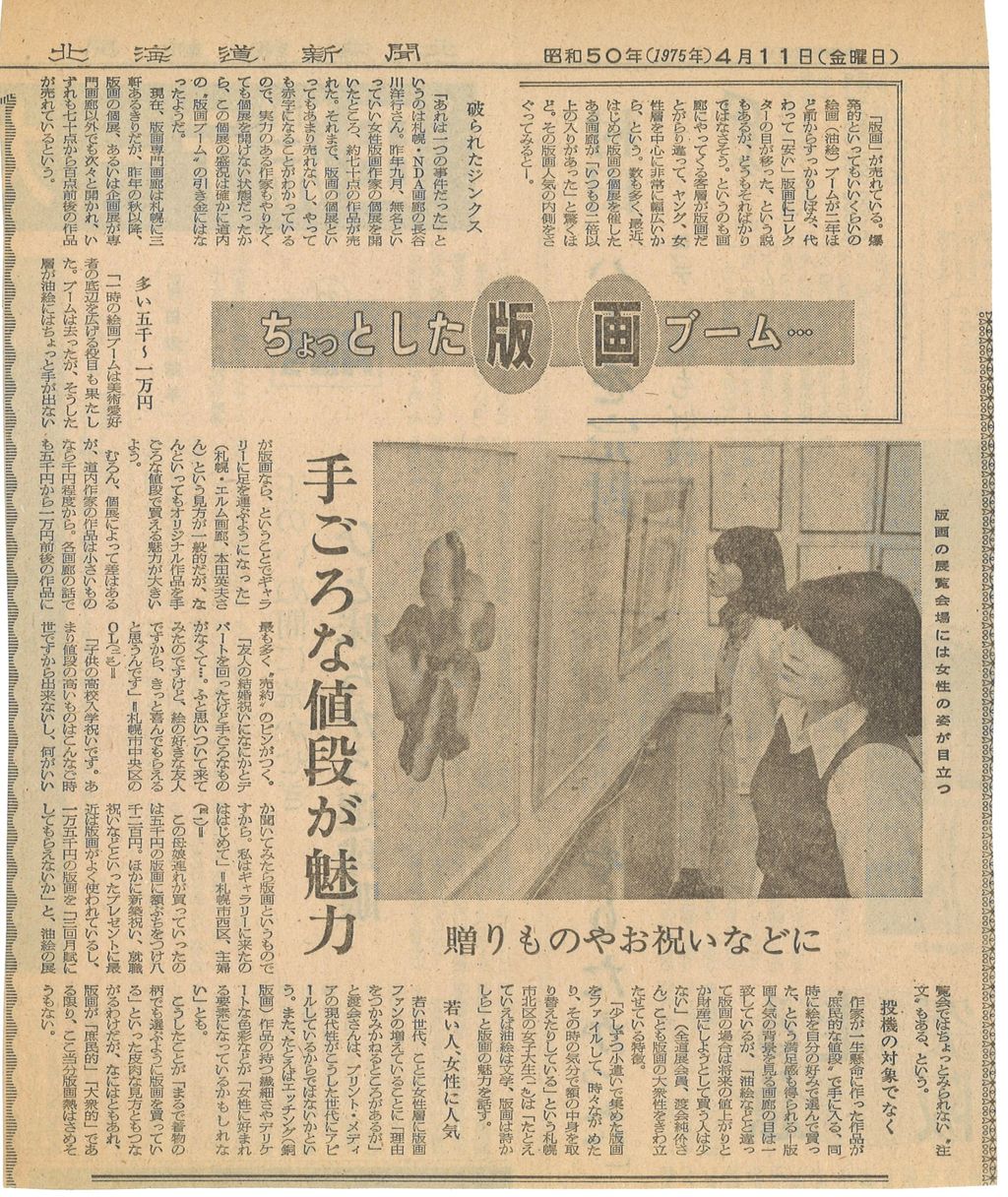 1975.4.1 現代版画センターの記録 全国縦断企画「版画への招待展」札幌展 全国縦断企画「版画への招待展」札幌展 会期:1975年4月1日~4月30日 会場:北海道札幌市・ガレリアドキュメンタ 主催:現代版画センター、ガレリアドキュメンタ 北海道新聞1975年4月11日<ちょっとした版画ブーム>