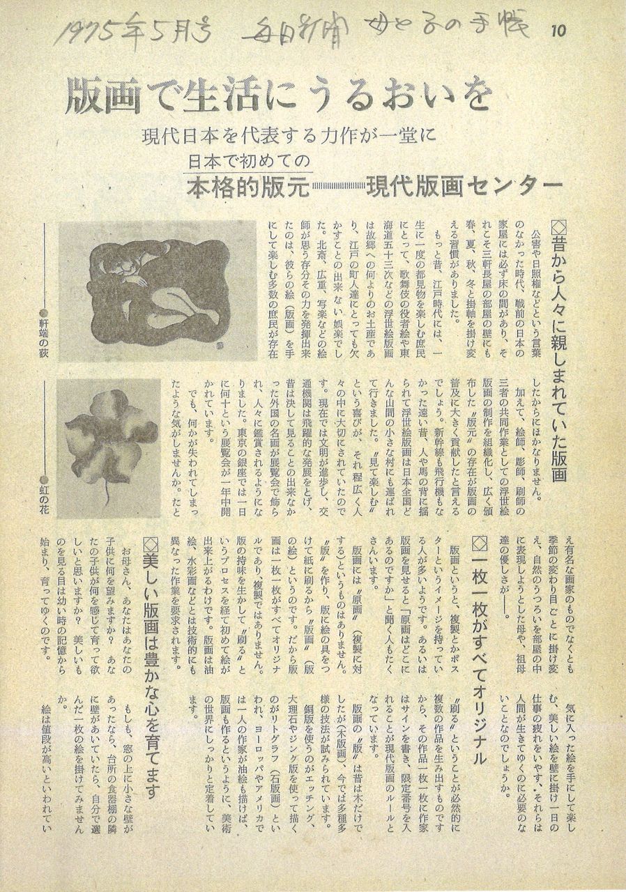 1975.5.1 現代版画センターの記録 『母と子の手帖』1975年5月号 現代版画センターは毎日新聞の関連事業としてスタートし、直接的には毎日東京不動産の管轄下に置かれ、本社から綿貫不二夫が専任として勤務した。 他のスタッフたちは法人化するまではアルバイト扱いだった。 『母と子の手帖』は毎日新聞が編集を担当していたので、このような広告記事を無料で掲載することができた。 『母と子の手帖』1975年5月号(通巻178号) 編集:毎日新聞社 発行:母子衛生研究会