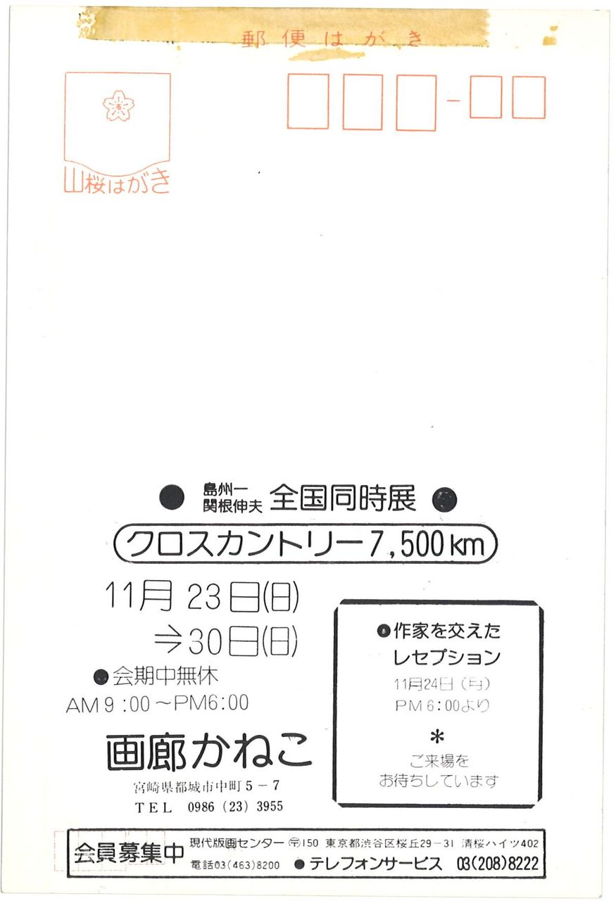 1975.11.23 現代版画センターの記録 「島州一・関根伸夫クロスカントリー7500km」都城・画廊かねこ 全国同時展「島州一・関根伸夫クロスカントリー7500km」都城・画廊かねこ 会期:1975年11月23日~11月30日 会場:宮崎県都城市・画廊かねこ 主催:画廊かねこ レセプション:11月24日18時~ 関根伸夫と現代版画センターの綿貫不二夫が出席