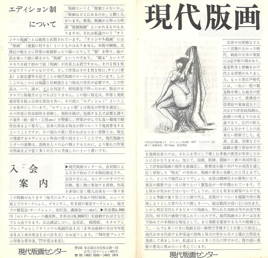 1976.12.1 現代版画センターの記録 入会案内「現代版画」1976年頃 「入会案内」はいくつも作成している。 この入会案内の発行日は特定できないが、内容から判断すると1976年に刊行されたものと思われる。