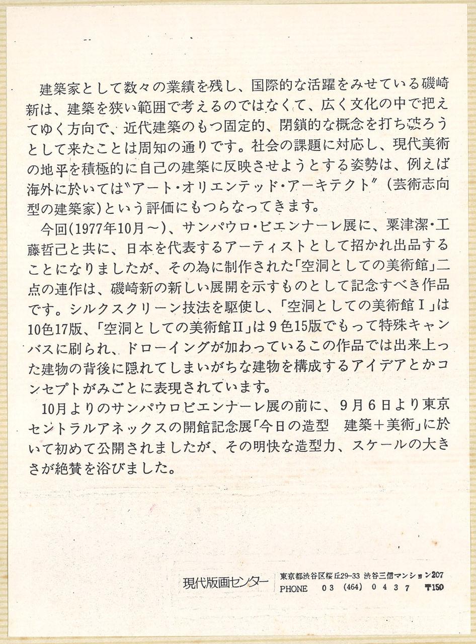 *現代版画センターのエディション・磯崎新「空洞としての美術館Ⅰ」「空洞としての美術館Ⅱ」を出品した。この2作品の刷りは石田了一。全700余点の中で最大スケールの作品であった。