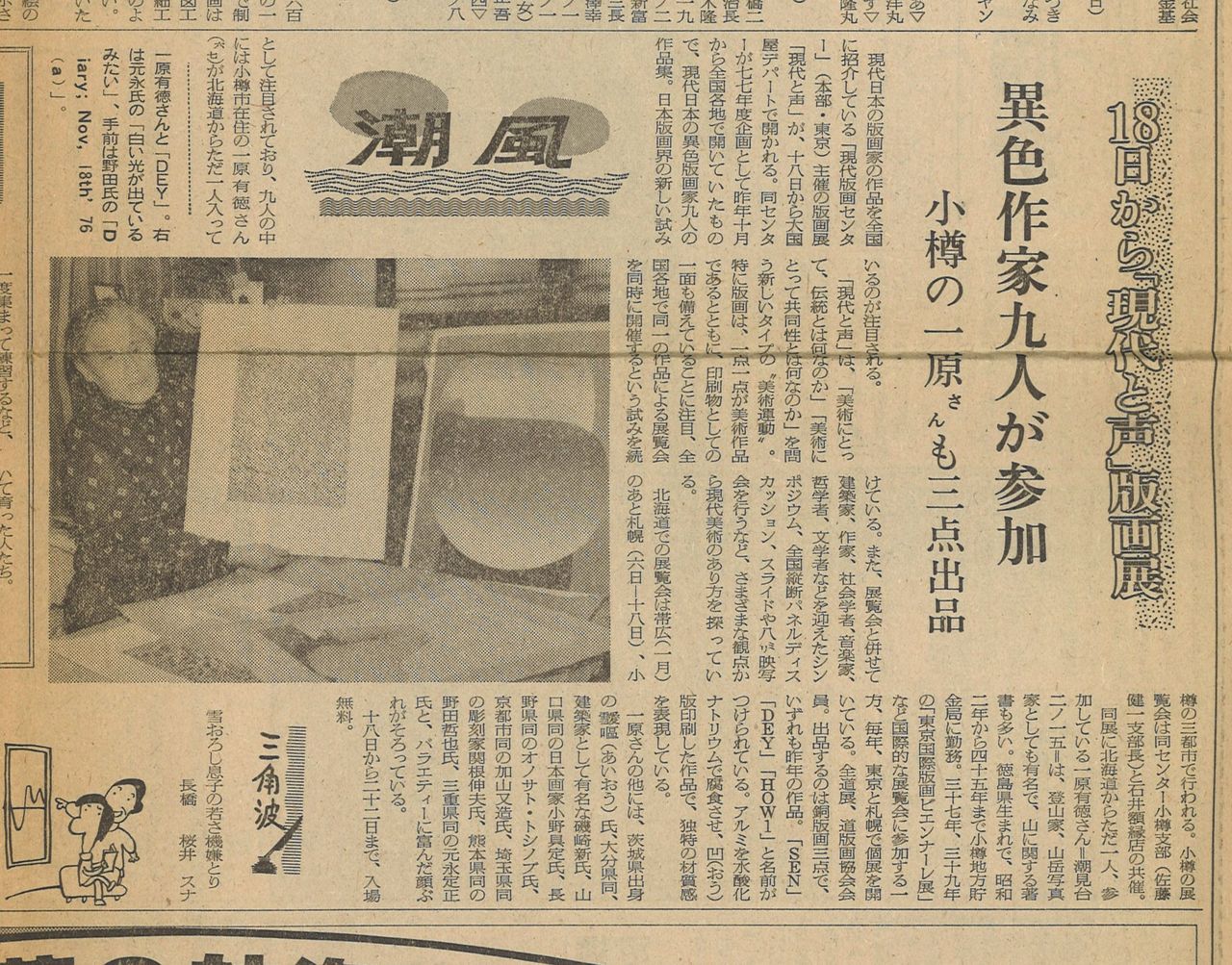 1978.2.18 現代版画センターの記録 「現代と声全国展」小樽展 「現代と声全国展」小樽展 会期:1978年2月18日~22日 会場:北海道小樽市・大国屋デパート 共催:現代版画センター小樽支部(佐藤健一)、石井額縁店 右が佐藤健一さん 北海道新聞1978年2月5日紙面