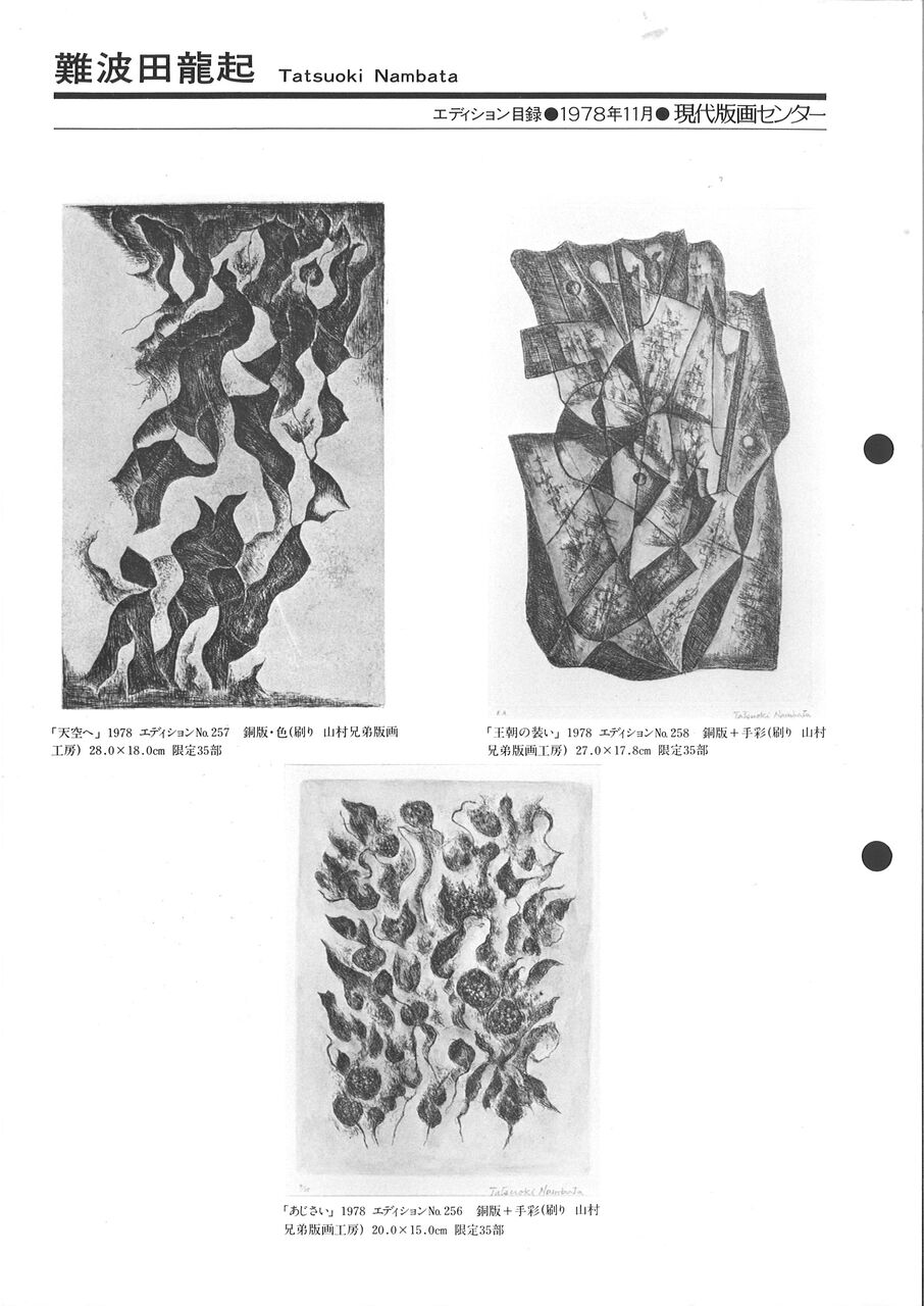 1978.11.1 現代版画センターの記録 難波田龍起 銅版画「天空へ」「王朝の装い」「あじさい」現代版画センターエディション 難波田龍起 銅版画(カラー作品) 「天空へ」銅版・カラー(刷り:山村兄弟版画工房) 限定35部 「王朝の装い」銅版+作家手彩色(刷り:山村兄弟版画工房) 限定35部 *単色刷りあり 「あじさい」銅版+作家手彩色(刷り:山村兄弟版画工房) 限定35部 *単色刷りあり 現代版画センターエディション