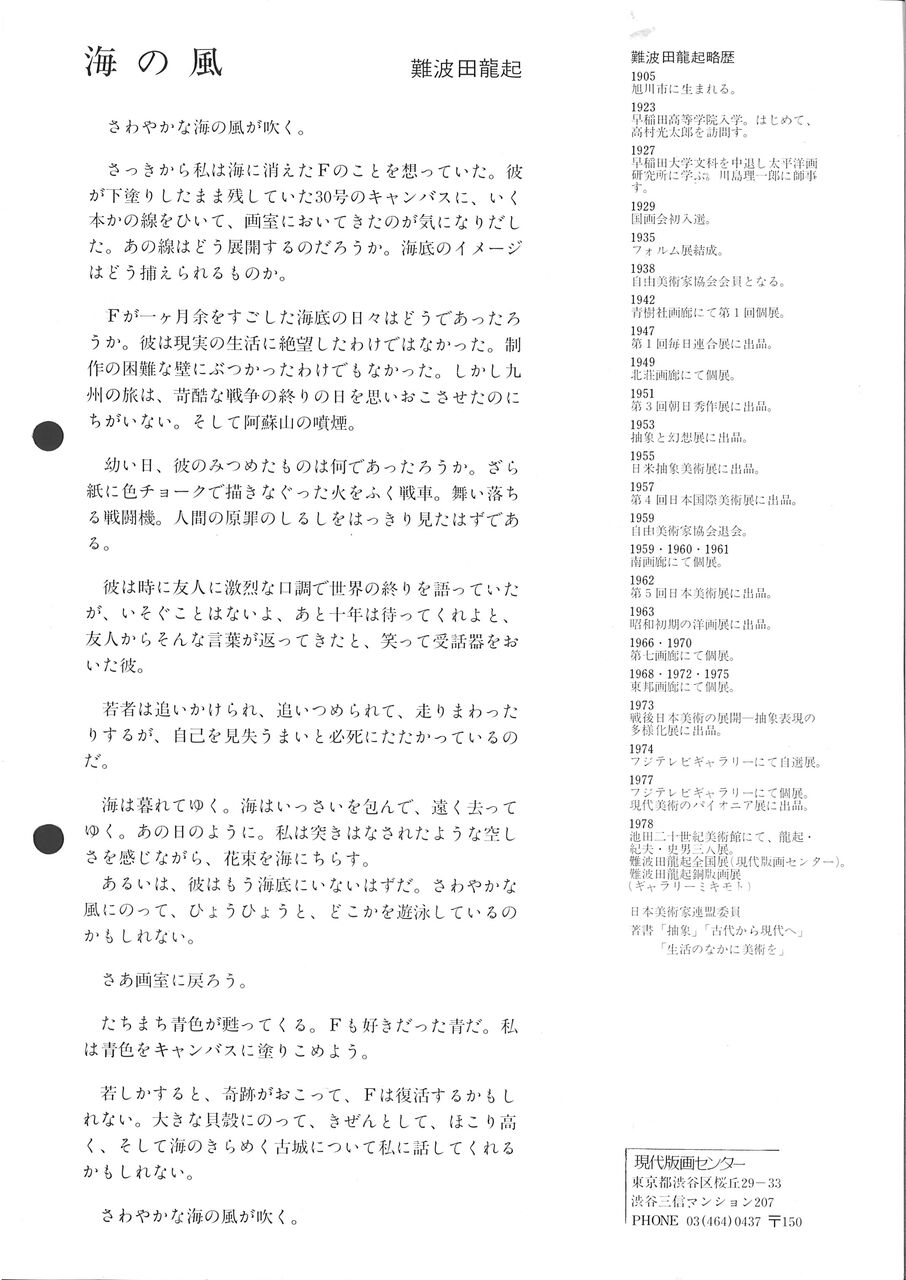 さっきから私は海に消えたFのことを想っていた。彼が下塗りしたまま残していた30号のキャンバスに、いく本かの線をひいて、画室においてきたのが気になりだした。あの線はどう展開するのだろうか。海底のイメージはどう捕えられるものか。