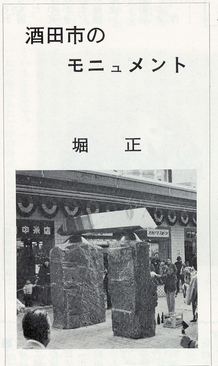 関根伸夫酒田市のモニュメント 昭和五十一年十月二十九日、酒田が大火……全国的に、テレビは赤々と報じた。そして二年後、私共住民にとっては、炎の熱気もさめやらぬ今ながら、次々と新しい商店が立ち並び、その核地点のショッピングモールには、力強いモニュメントが行きかう人々に新生の息吹きを与えている。