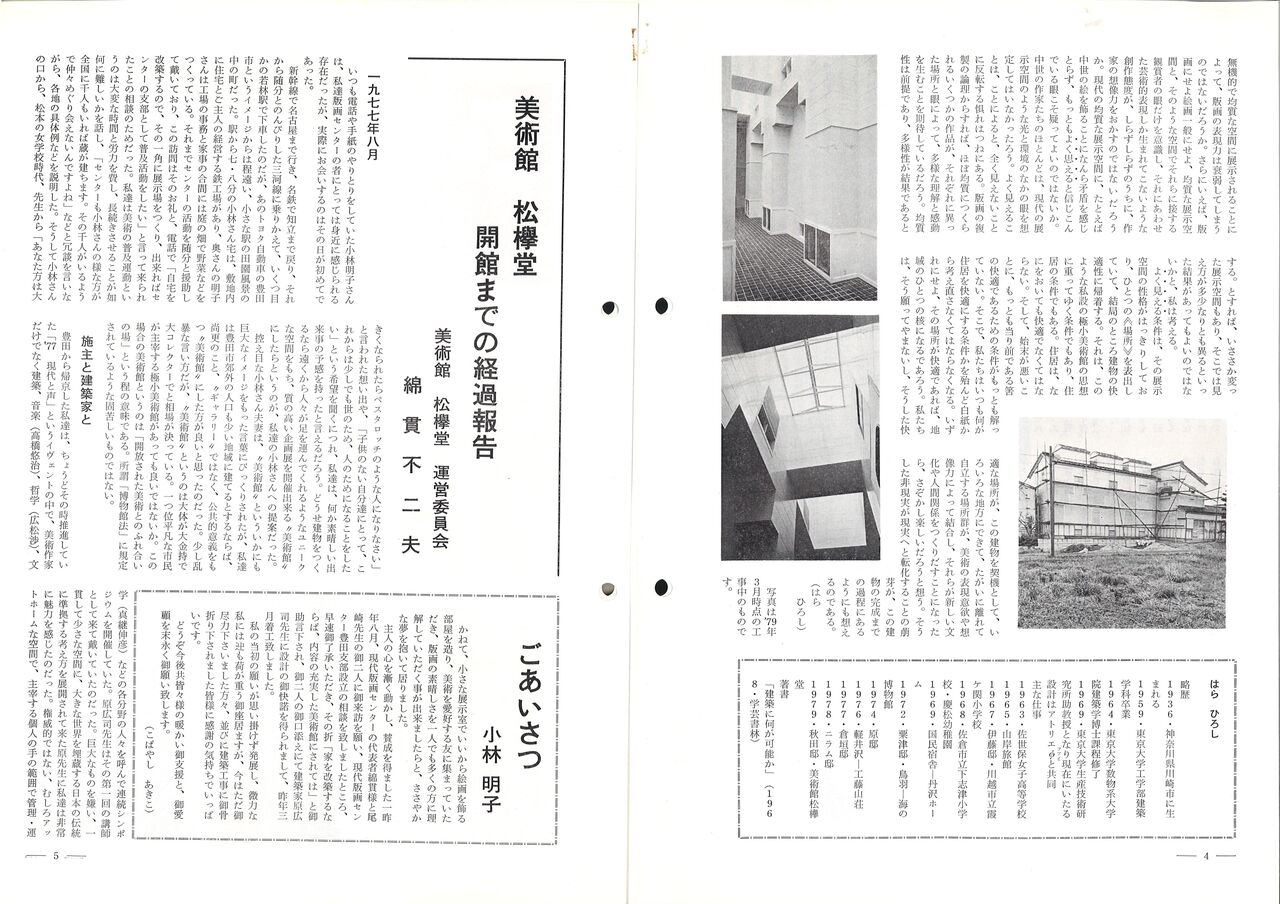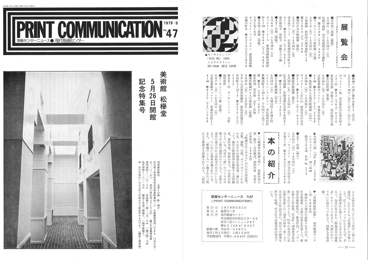 1979.5.1 建築を訪ねて 現代版画センターの記録 版画センターニュース No.47 美術館 松欅堂開館記念特集号 版画センターニュース No.47 発行日:1979年5月1日/美術館 松欅堂 5月26日開館 記念特集号 発行:現代版画センター 執筆:原広司、小林明子、綿貫不二夫、植田実、牛久保公典、 美術館 松欅堂 設計:原広司+アトリエΦ(ファイ) 場所:愛知県豊田市 館主:小林明子 美術館 松欅堂友の会会長:船木仁