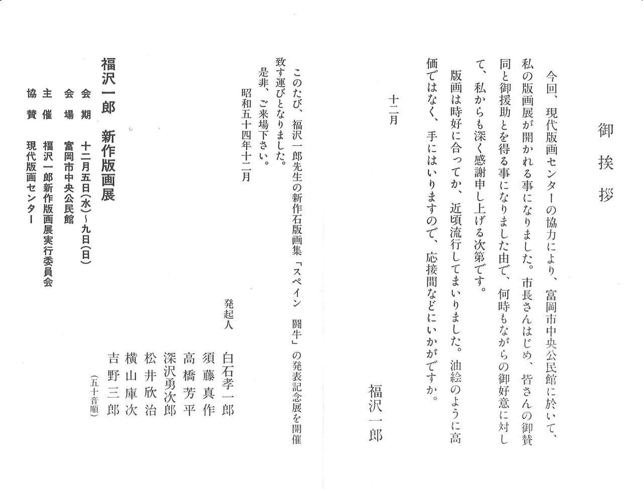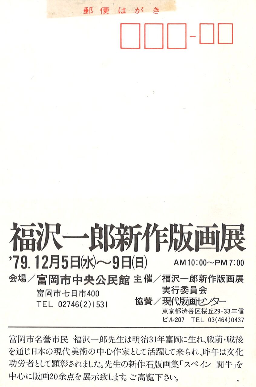 1979.12.5 現代版画センターの記録 「福沢一郎新作版画展」富岡市中央公民館 「福沢一郎新作版画展」 会期:1979年12月5日~9日 会場:富岡市中央公民館 主催:福沢一郎新作版画展実行委員会 協賛:現代版画センター