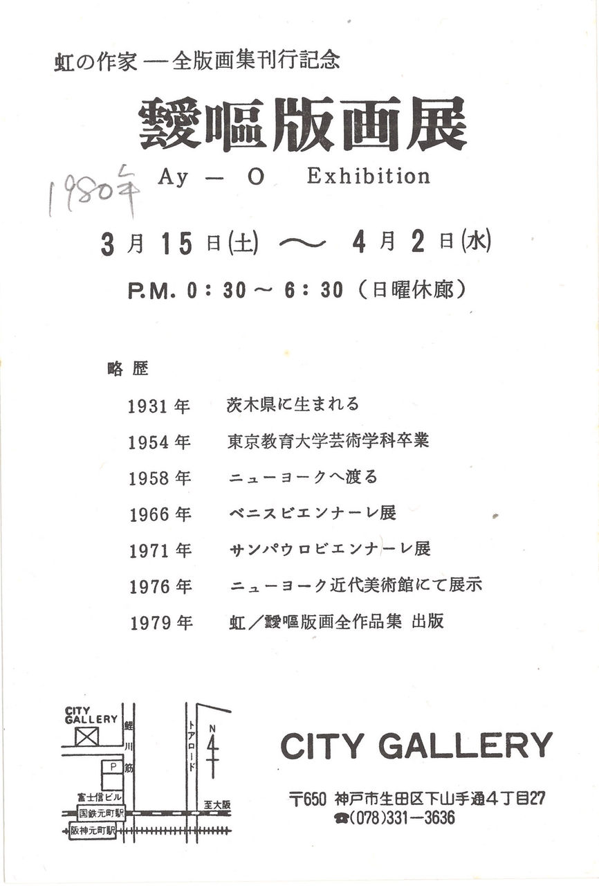 1980.3.15 靉嘔 Ay-O の世界 現代版画センターの記録 「靉嘔版画展 虹の作家全版画集刊行記念」神戸・シティギャラリー 「靉嘔版画展 虹の作家全版画集刊行記念」 会期:1980年3月15日~4月2日 会場:兵庫県神戸市 シティギャラリー 主催:現代版画センター神戸支部(シティギャラリー 向井修一)