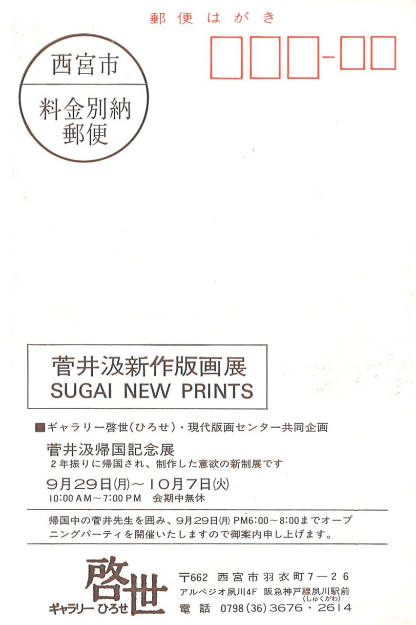 1980.9.29 現代版画センターの記録 「菅井汲 新作版画全国展」西宮市・ギャラリー啓世 「菅井汲 新作版画全国展」 会期:1980年9月29日~10月7日 会場:西宮市・ギャラリー啓世 主催:ギャラリー啓世、現代版画センター共同企画 ・オープニングパーティ:9月29日