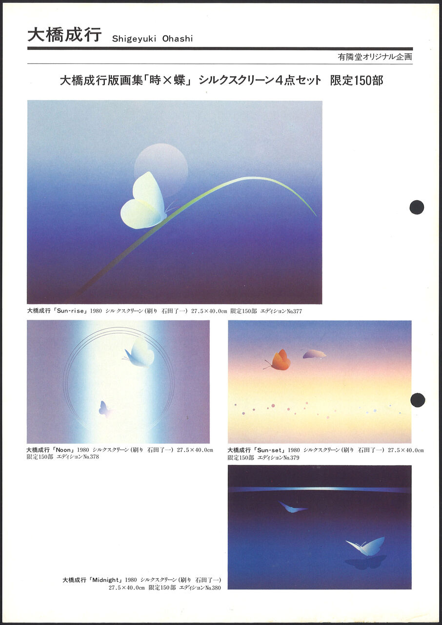 1980.12.31 現代版画センターの記録 大橋成行 版画集「時×蝶」より:「Sun-rise」「Noon」「Sun-set」「Midnight」現代版画センターエディション 大橋成行 新作エディション発表 版画集「時×蝶」より シルクスクリーン4点セット: 「Sun-rise」 「Noon」 「Sun-set」 「Midnight」 ・有隣堂オリジナル企画 ・シルクスクリーン(刷り:石田了一) ・制作年:1980 現代版画センターエディション No.377 ~ 380 *横浜・有隣堂との共同エディションとして発表、正確な発行年月日は不詳(調査中)