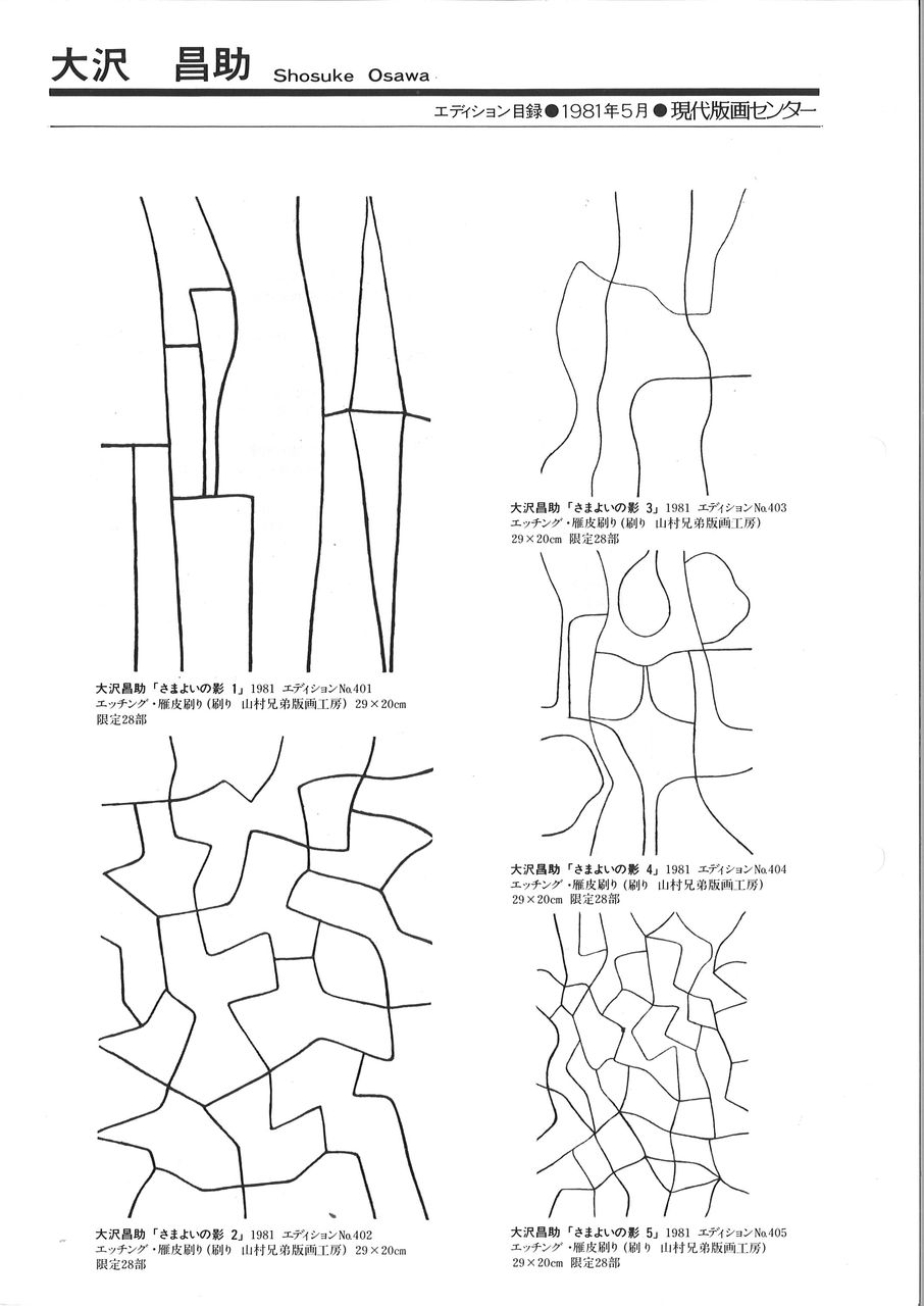 1981.5.1 現代版画センターの記録 大沢昌助「さまよいの影」 大沢昌助 「さまよいの影」 1981年 銅版(エッチング・雁皮刷り)連作5点(刷り:山村兄弟版画工房 山村常夫・山村素夫) 現代版画センターエディションNo.401~No.405