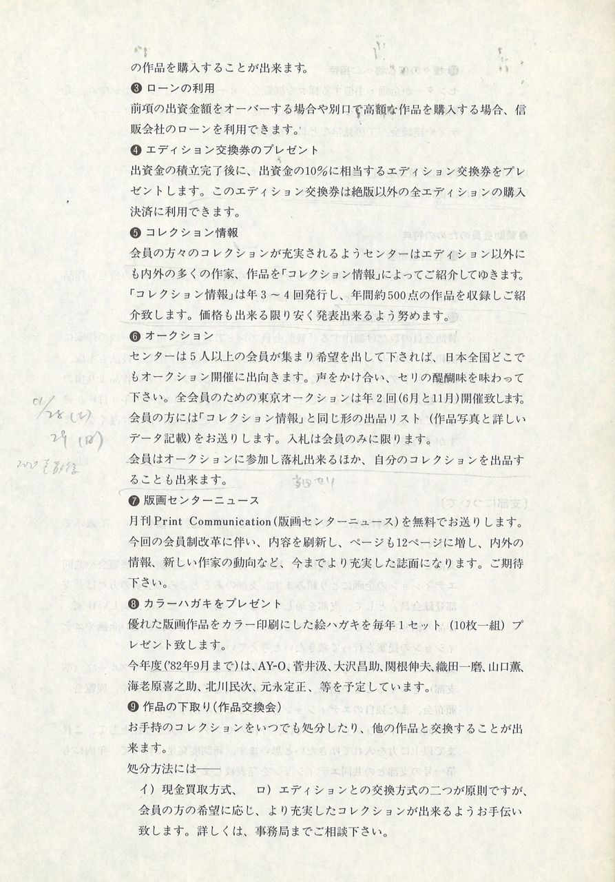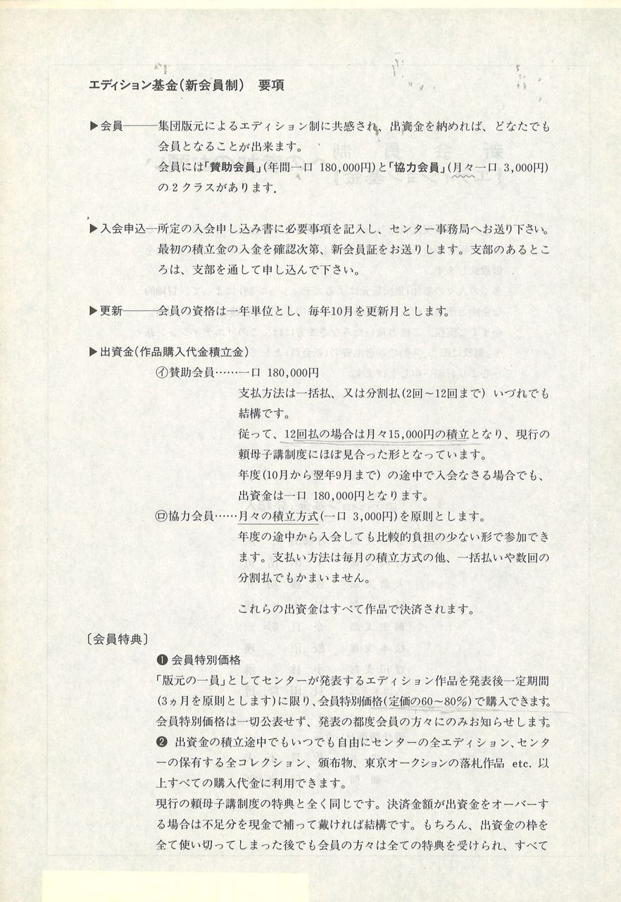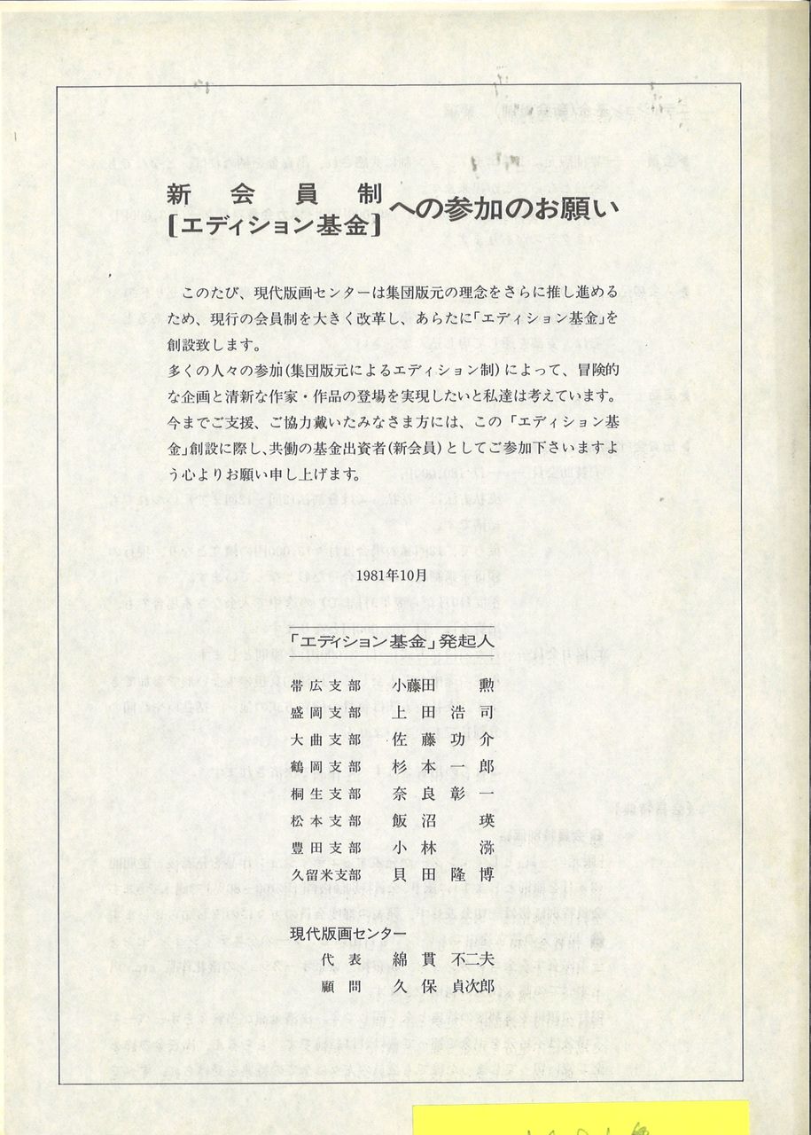 1981.10.1 現代版画センターの記録 新会員制『エディション基金』への参加のお願い 新会員制『エディション基金』への参加のお願い 1974年に創立した現代版画センターの会員は、年間3,000円(のちに4,000円)の会費を払うことになっていた。 1981年に「集団版元によるエディション制」を一層深めるために制度を変更した。