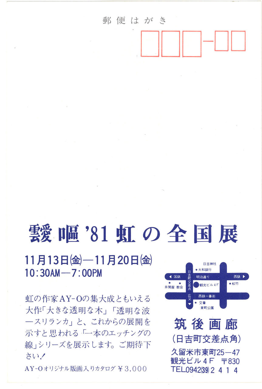 1981.11.13 靉嘔 Ay-O の世界 現代版画センターの記録 「靉嘔 '81虹の全国展」福岡県久留米・筑後画廊 「靉嘔 '81虹の全国展」 会期:1981年11月13日~20日 会場:福岡県久留米市・筑後画廊 主催:現代版画センター久留米支部(筑後画廊 貝田隆博)