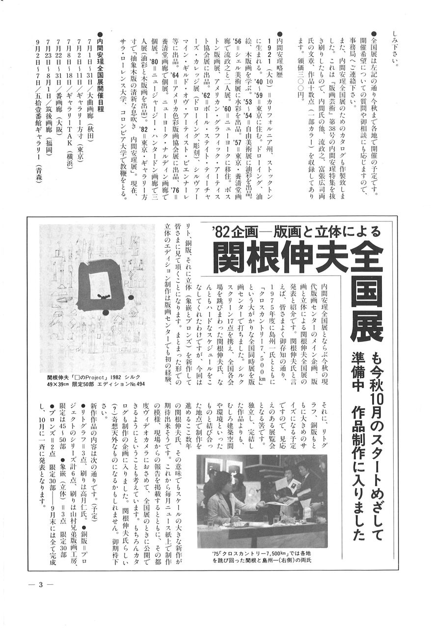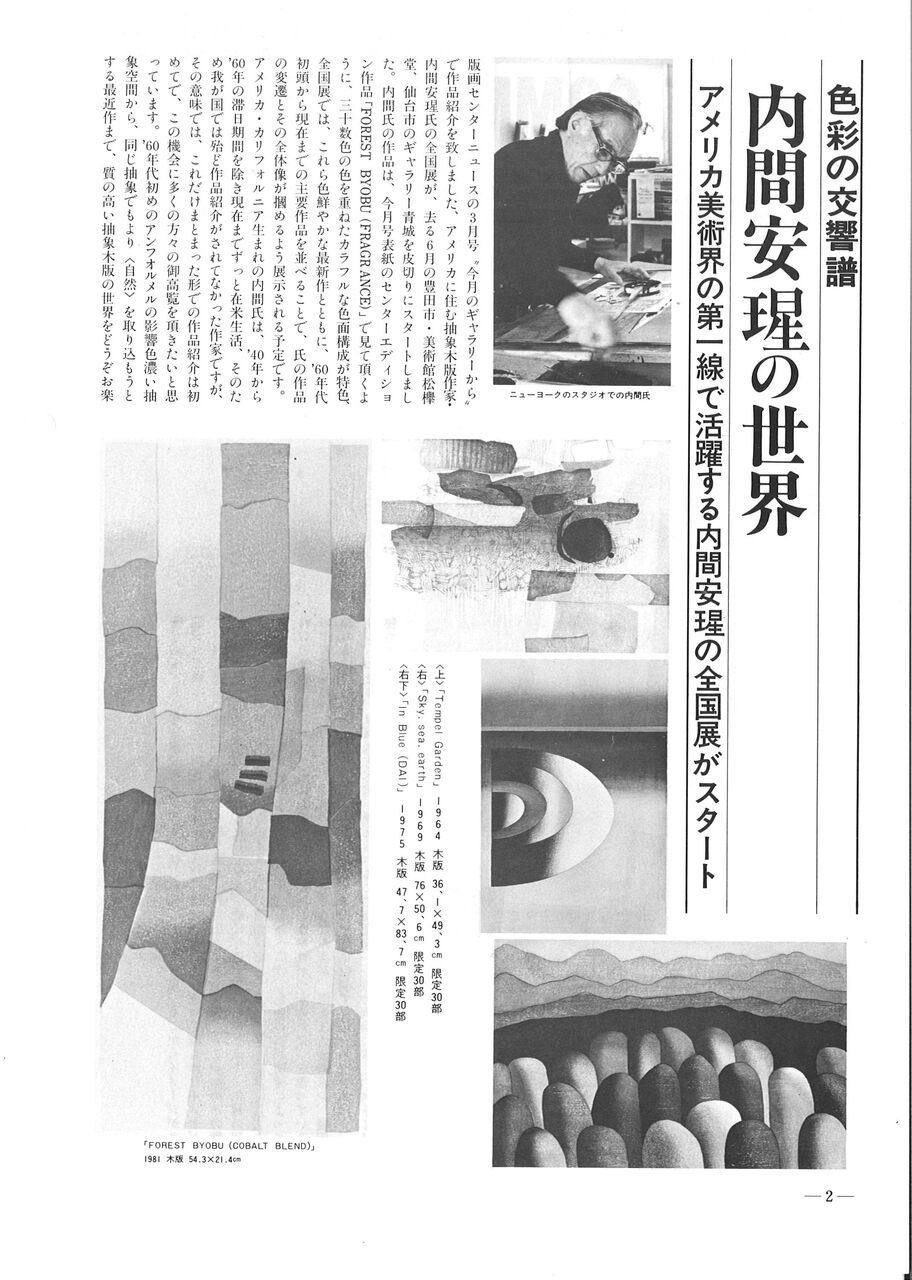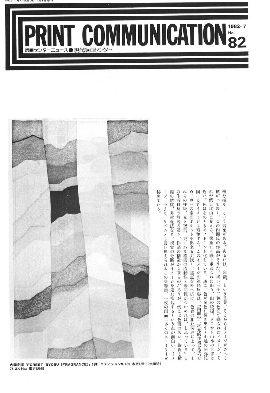 1982.7.1 内間安瑆の世界 現代版画センターの記録 版画センターニュース No.82 ●「Print Communication 版画センターニュース」No.82 発行日:1982年7月1日 1982年7月から現代版画センター企画「内間安瑆全国展」がスタートする 秋田・大曲画廊、東京・ギャラリー方寸、横浜・ギャラリーTAK、大阪・番画廊、福岡・筑後画廊、青森・五拾壱番館ギャラリー、愛知・美術館松欅堂、仙台・ギャラリー青城、山形・しろがね美術サロン、和歌山・ギャラリービュッフェファイブ