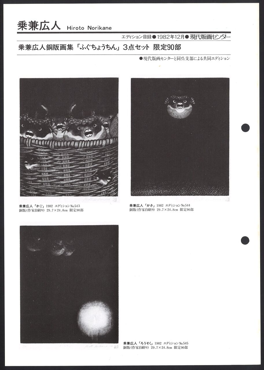 1982.12.1 現代版画センターの記録 乗兼広人 銅版画集「ふぐちょうちん」より:「かご」「かさ」「ろうそく」現代版画センターエディション 乗兼広人 新作エディション発表 銅版画集「ふぐちょうちん」より: 「かご」 「かさ」 「ろうそく」 ・現代版画センターと同呉支部(広島県・ギャラリーたかお)による共同エディション ・銅版(作家自刷り) ・制作年:1982 現代版画センターエディション No.543 ~ 545