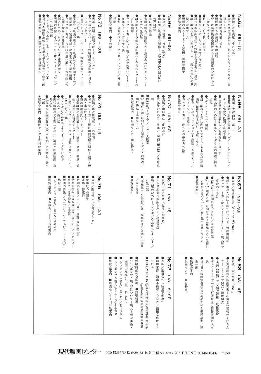 1983.1.1 現代版画センターの記録 PRINT COMMUNICATON (版画センターニュース)No.65~No.75オリジナル入り合本 PRINT COMMUNICATON (版画センターニュース)No.65~No.75 オリジナル入り合本 発表価格:5,000円 大沢昌助 「正方形の組み合せ」 ・シルクスクリーン(刷り:岡部徳三) ・制作年:1983 ・サイズ:15×10cm ・限定500部 ・刷り込みサイン 現代版画センターエディション No.542