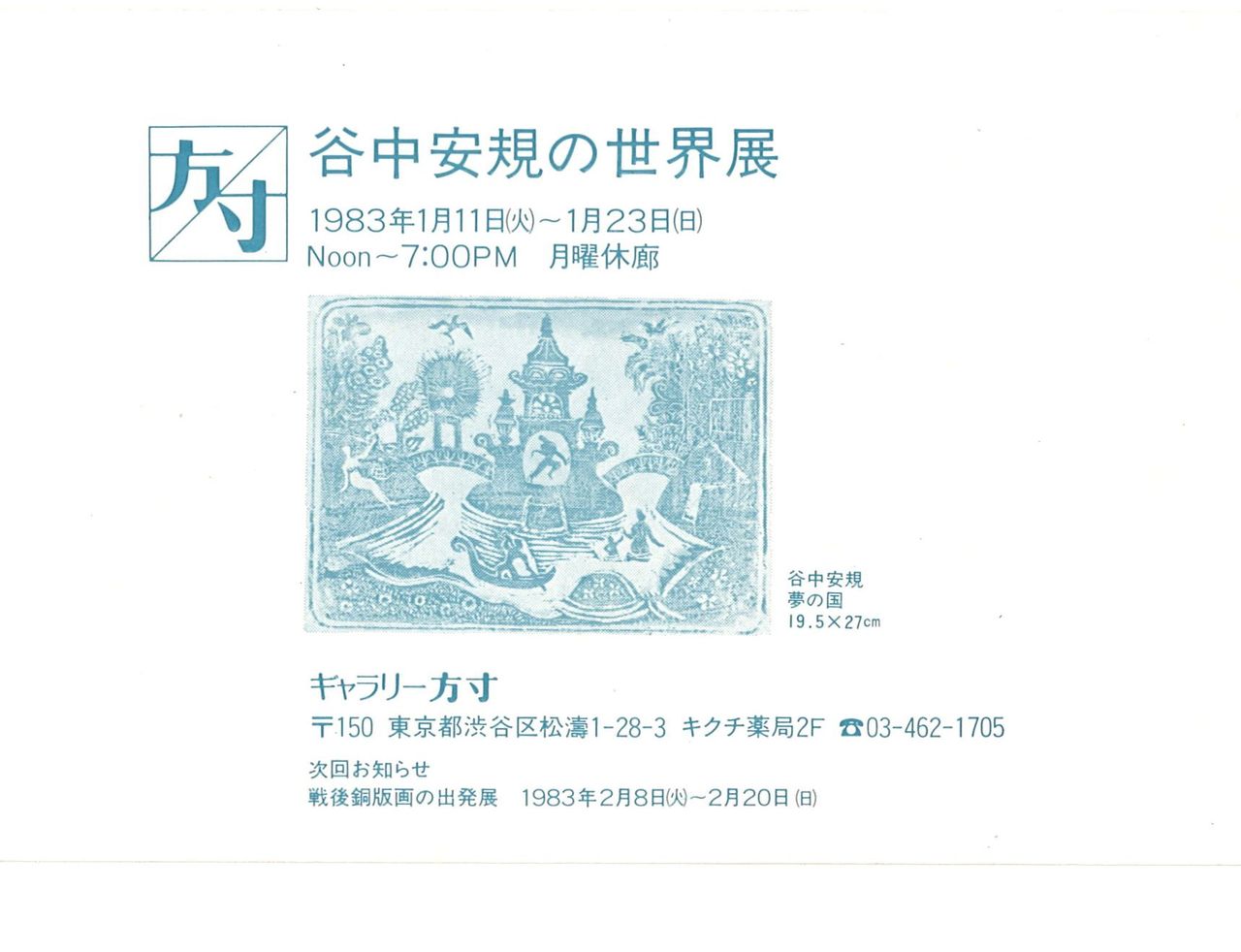 1983.1.11 創作版画について 現代版画センターの記録 「谷中安規の世界展」ギャラリー方寸 「谷中安規の世界展」 会期:1983年1月11日~1月23日 会場:渋谷区松涛・ギャラリー方寸 主催:現代版画センター 出品協力:桝田コレクション