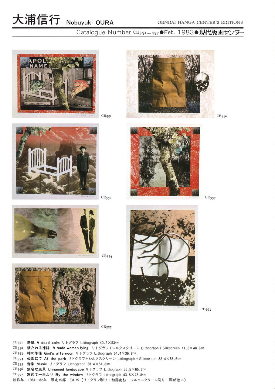 1983.2.1 現代版画センターの記録 大浦信行「無風」「横たわる裸婦」「神の午後」「公園にて」「音楽」「無名な風景」「窓辺でー白より」 大浦信行「無風」「横たわる裸婦」「神の午後」「公園にて」「音楽」「無名な風景」「窓辺でー白より」 1981年~1982年に制作 リトグラフ(刷り:加藤南枝)、シルクスクリーン(刷り:岡部徳三) Ed.75 現代版画センターエディションNo.551~557