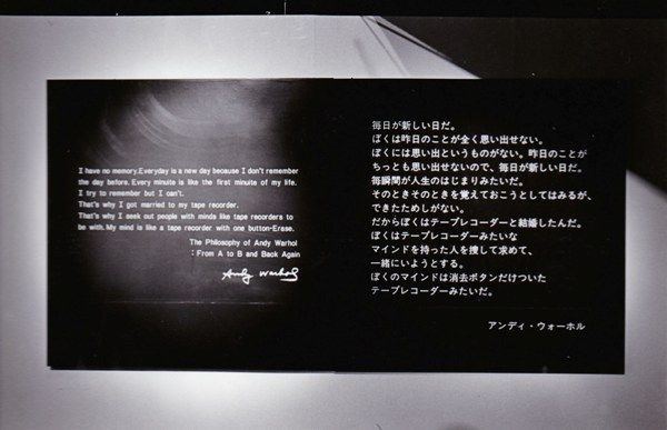 今までウォーホルは部分的には見てるんですよ、で、今日一貫した形で見せてもらって、やっぱり相当な迫力ですね。離れてたものがつながってくるんですよね。ああ、あの人の作品はこの部分でウォーホルの影響を受けたんだとかね、そういうことをしみじみ感じました。で、彼が時代を象徴するチャンピオンだというのが、何故そうなのか、僕は素人だから分からなかったわけで、きょう見てはっきり分りましたね。その、何でもない普通のところが素晴らしいんだね。普通で素晴らしいというのは最高だと思うねェ。で、僕はウォーホルみたいに多面的な顔をもちたいと思うね。僕は役者だから。