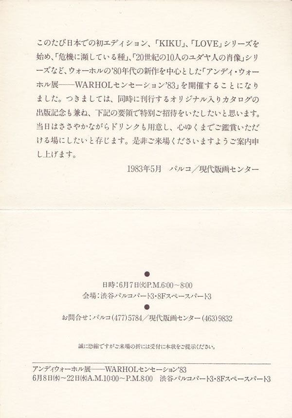 1983年6月7日、東京渋谷は、パルコ・パート3のアンディ・ウォーホル展オープニング・パーティは、ヴェルヴェット・アンダーグラウンドの音楽がBGMで流れるなか、開会の挨拶もなければ乾杯もなしという、いうなればウォーホル的幕開きで流れるように始まりました。参加者は、招待状をもってきた人約七百人、その他かなりの飛び込み参加者もいたりという具合で、夕刻6時よりの約2時間半、本当にちょっと名状し難い興奮に包まれました。参加者の各人各様のコメントは後段に譲るとして、好きにしろ嫌いにしろ、これほどオープニング・パーティという一種の儀式的場(普通は作品さえ見られないような)においてさえ、強烈なインパクトを与えるアンディ・ウォーホルという人間のすごさは、80年代のアート・シーンに特記すべきことでしょう。それはまた版画のそれこそ同時多発的な特性と、我が国で初のウォーホル・エディションに依るところが大きいとも言えます。恐らくこの1983年のウォーホル新体験は、全国各地にこれから拡がってゆくことでしょう。何より、その何千、何万というウォーホル・イメージをまず共有したいと版画センターは考えます。各地の様々な方々の手でウォーホル展を是非とも成功させて下さい。