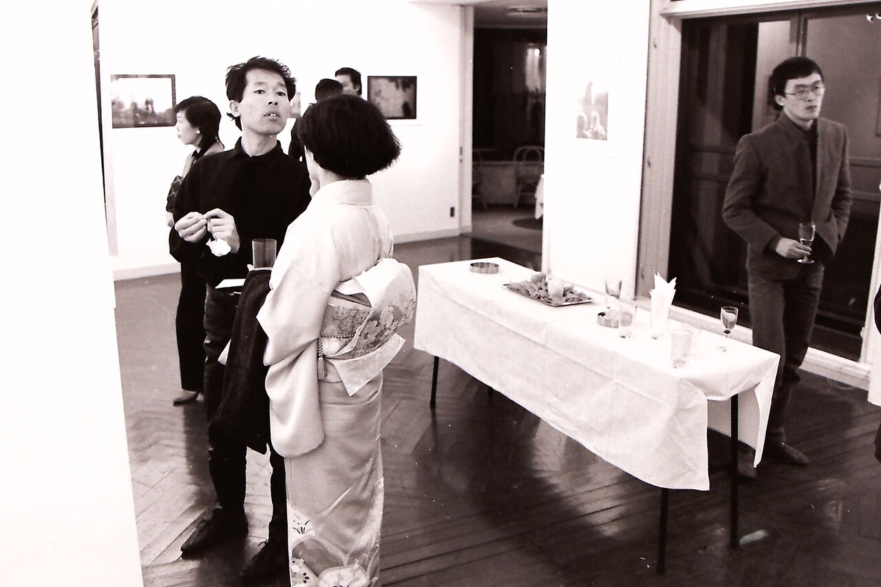 19831201原美術館レセプション右から、原俊夫館長、ジョナス・メカス