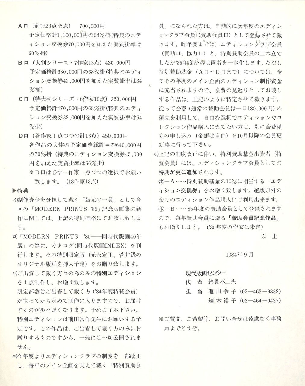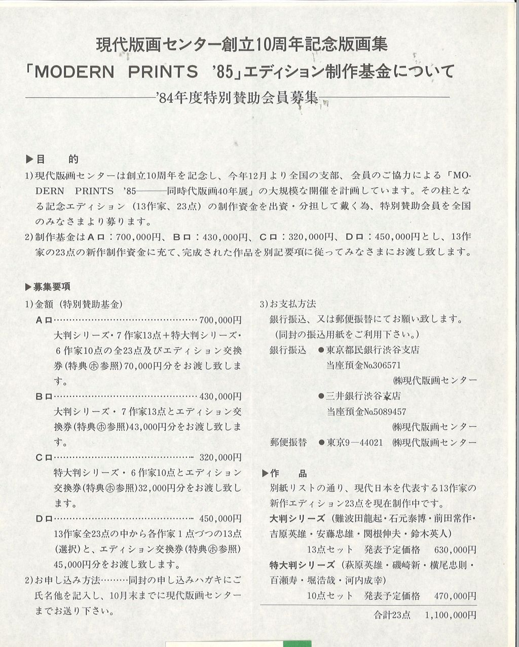 1984.9.1 現代版画センターの記録 ’84年度特別賛助会員募集 現代版画センター創立10周年記念版画集 「MODERN PRINTS '85」エディション制作基金について ー'84年度特別賛助会員募集ー