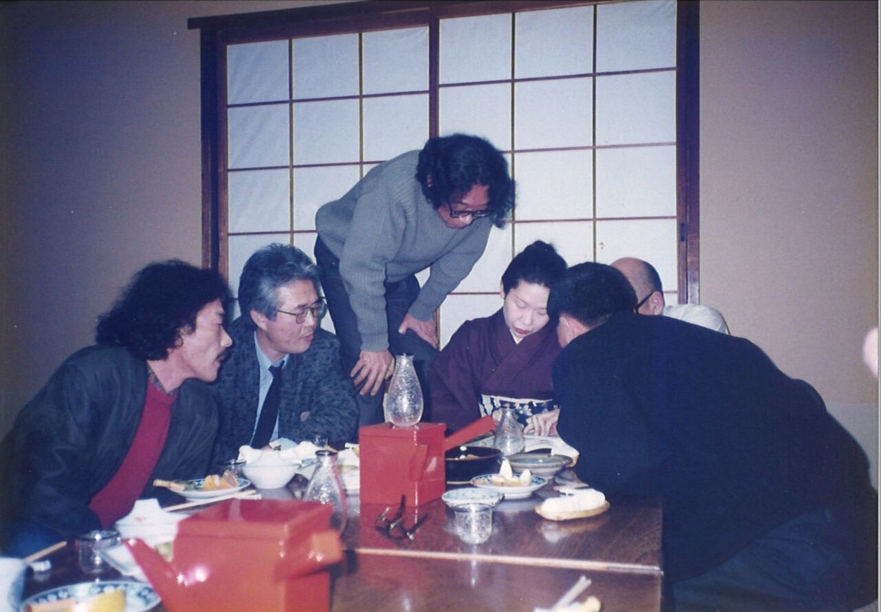 1991.3.29 画廊亭主の徒然なる日々 MORIOKA第一画廊『舟越桂 銅版画展』を見に行く 『舟越桂 銅版画展』 会期:1991年3月20日~4月10日 主催・会場:MORIOKA第一画廊 1991年3月29日 盛岡・直利庵にて 左から、百瀬寿、中村光紀、上田浩司、松井裕子、萬木康博(後ろ姿)、綿貫不二夫