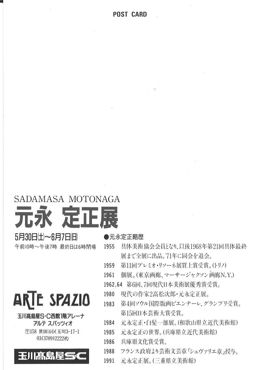 1992.5.30 新着作品・イベント情報 玉川高島屋『元永定正展』 『元永定正展』 会期:1992年5月30日~6月7日 会場:玉川高島屋S・C西館1階アレーナ アルテ・スパッツィオ 主催:玉川高島屋 協力:企画室B(ときの忘れものの前身) ・案内状