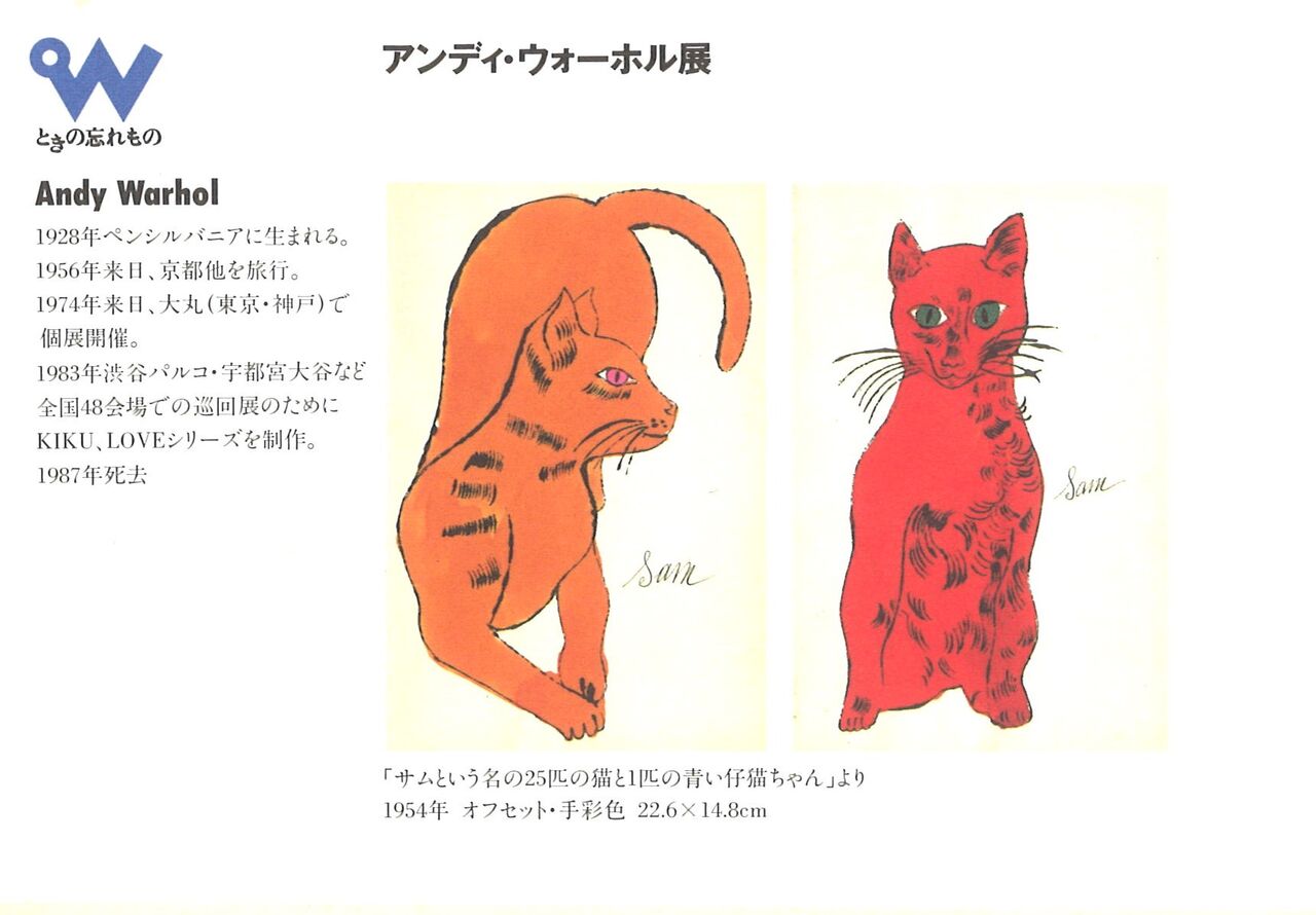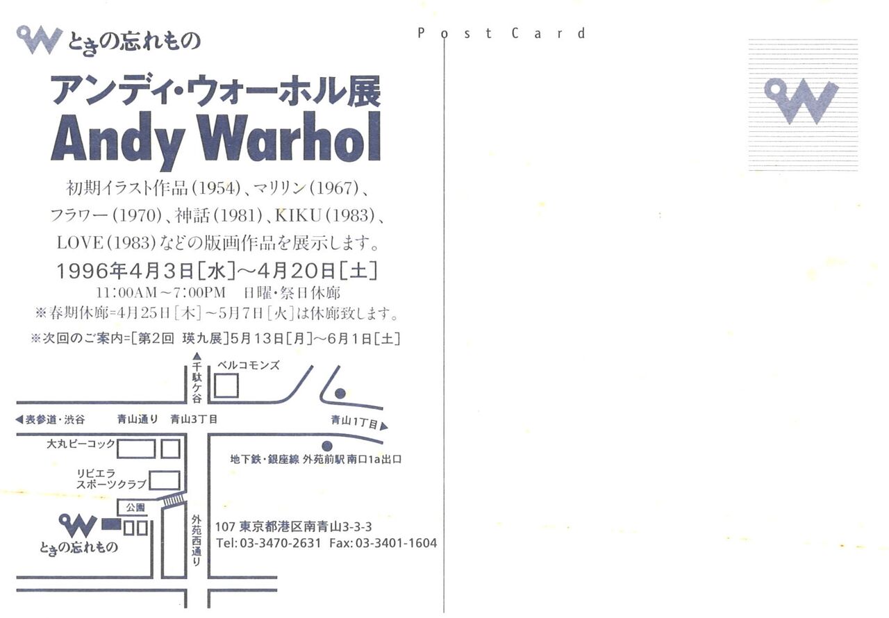 1996.4.3 新着作品・イベント情報 『アンディ・ウォーホル展』南青山・ときの忘れもの 『アンディ・ウォーホル展』 会期:1996年4月3日~4月20日 会場:ときの忘れもの(南青山3丁目、一軒家時代) 1995年6月に南青山3丁目の木造一軒家で開廊した「ときの忘れもの」の第12回企画展。 ウォーホルの初期作品、マリリン、フラワー、神話などの代表作、現代版画センター時代にエディションした「KIKU」や、「LOVE」などを展示。