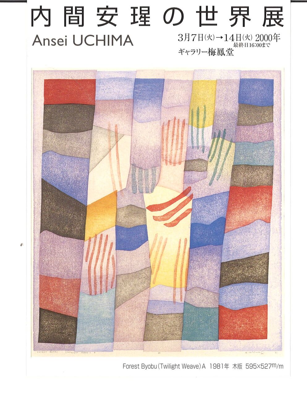 2000.3.7 新着作品・イベント情報 内間安瑆の世界 旭川・梅鳳堂「内間安瑆の世界展」 「内間安瑆の世界展」 会期:2000年3月7日(火)~14日(火) 主催/会場:北海道旭川・ギャラリー梅鳳堂 協力:ときの忘れもの