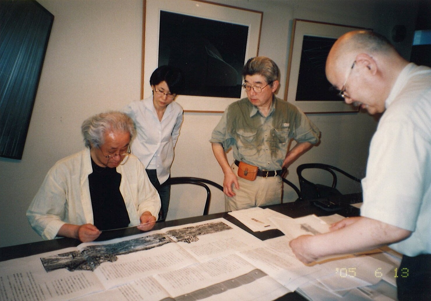 左から刷り師の白井四子男さん、磯崎新先生、植田実先生、入社初日の尾立麗子、綿貫不二夫