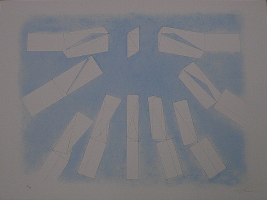 堀内先生に、いわば彫刻の秘密の展開図ともいうべき版画制作を勧めたのは私だが、現代版画センター時代に手掛けた5~6点をいれても総数で10点に満たない。堀内版画の中で最も大作がこの「かたむくカタチ」である。