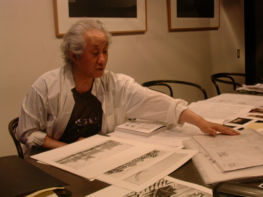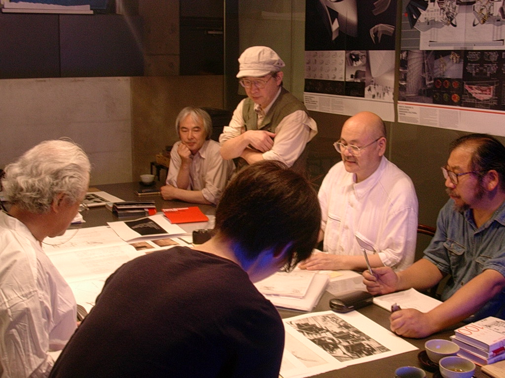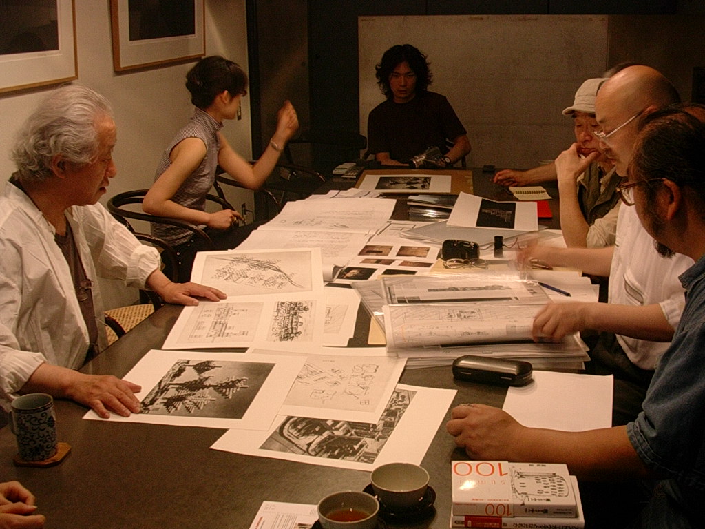 18時から磯崎新アトリエで磯崎新連刊画文集『百二十の見えない都市』の制作打ち合わせだったので、手土産に生水ようかんを持って、アトリエの平田さんに磯崎新モスクワ展の様子を伺うため、少し早めにアトリエへ向いました。入社初日の仕事が、磯崎先生と画文集の打ち合わせでした。もう3週間前の話です。前回と同じく、メンバーは編集長の植田実先生、刷り師の石田さん、白井さん、綿貫さん、そして私です。予定より早く打ち合わせが始まり、モスクワ展の展示のために出張されてきた張さんと平田さんらにモスクワ展の写真と図面を見ながら、展示の様子を説明して貰いました。廃虚のような古い建物のレンガの壁に、外光を遮断し、ブラックライトのみで照らされた版画や写真が飾られ、2階にはアルミに蛍光色でシルク刷りされた作品「エレクトリック・ラビンス」が軋む音などの効果音(一柳慧、ルイジ・ノーノ)とともに回転していました。3階には、Re-ruined Hiroshima が3m×10mの巨大パネルになっていました。幽霊屋敷みたいだったそうです。磯崎新先生との『百二十の見えない都市』の打ち合わせは、淡々と決まっていき、新たに決まったものもあり、全部で12都市分あるので残り3都市となりました。