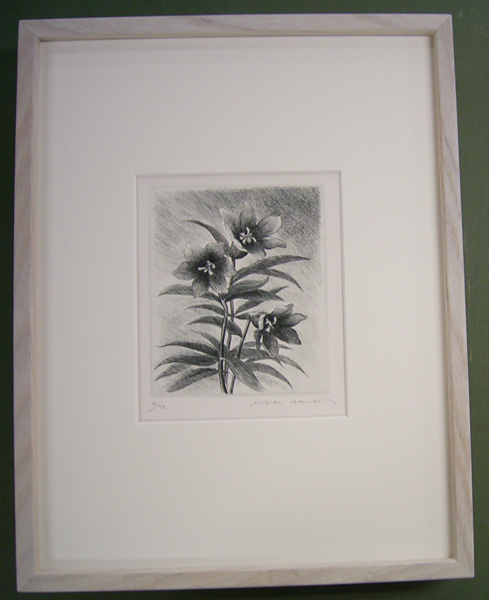 ◆作品のワンポイント/この作品は、北国の花というテーマで制作していただいたもののひとつで、樹木を描くときの厳しさとは違い、黒百合のけなげに咲く様子が、やさしいタッチで描かれています。
