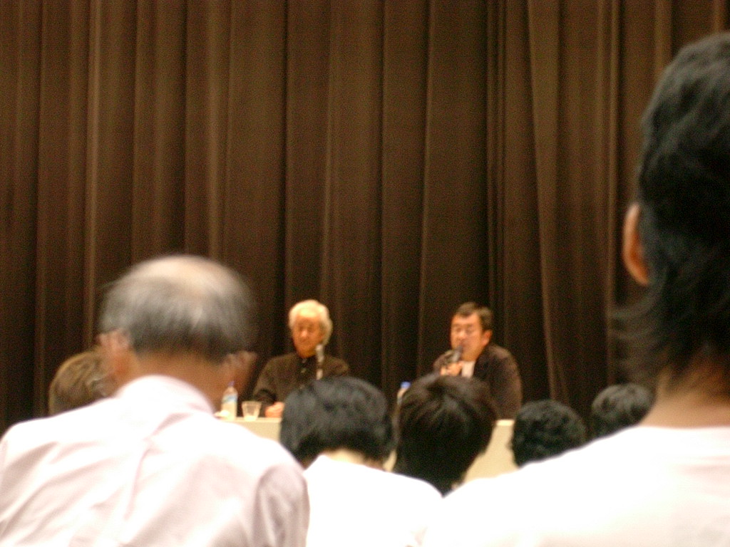 笑いを交えながら隈先生は、建築家には岸田日出刀さん、丹下健三さん…のタイプと、岡本太郎さん、磯崎新さんタイプの2種類がいるという。岡本太郎さんと磯崎新さんは、ユートピアを描く。私は磯崎先生のスケッチを見る機会が多く、たまに何の絵かわからない時があるが、磯崎先生はそれを説明する。天才という言葉がしっくりくる。「一つの瞬間に一つの存在を信じる」、偶然の関係を見てみたい、プロセスを信じたいとおっしゃる磯崎新先生。