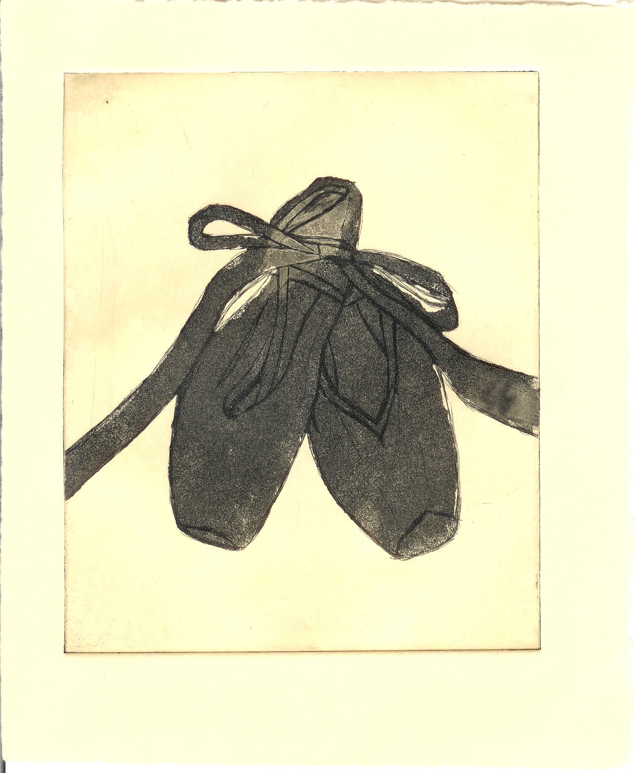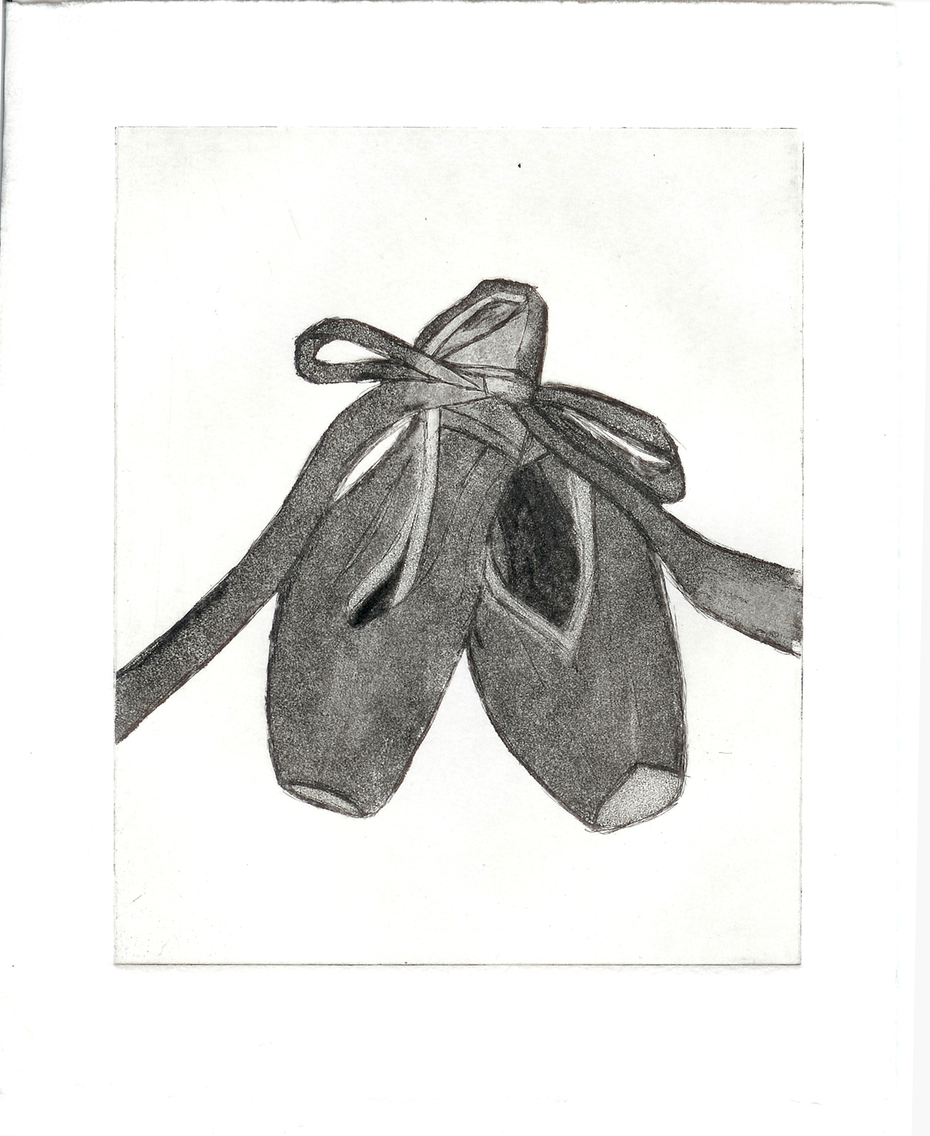 版画教室では私を含めて生徒数3人だった。前回制作していた姉のバレエのトーシューズを描いた銅版画の試刷りを行った。平べったい出来上がりだったため、皆に意見をしてもらい、ルーレットとバニッシャーで明暗を付けて補正した。用紙によって印象が変わることを知った。結局5枚試刷りをしてもらい、徐々に立体感が出てきた。次回は、本刷りができるようもっとリアルにしていこうと思う。