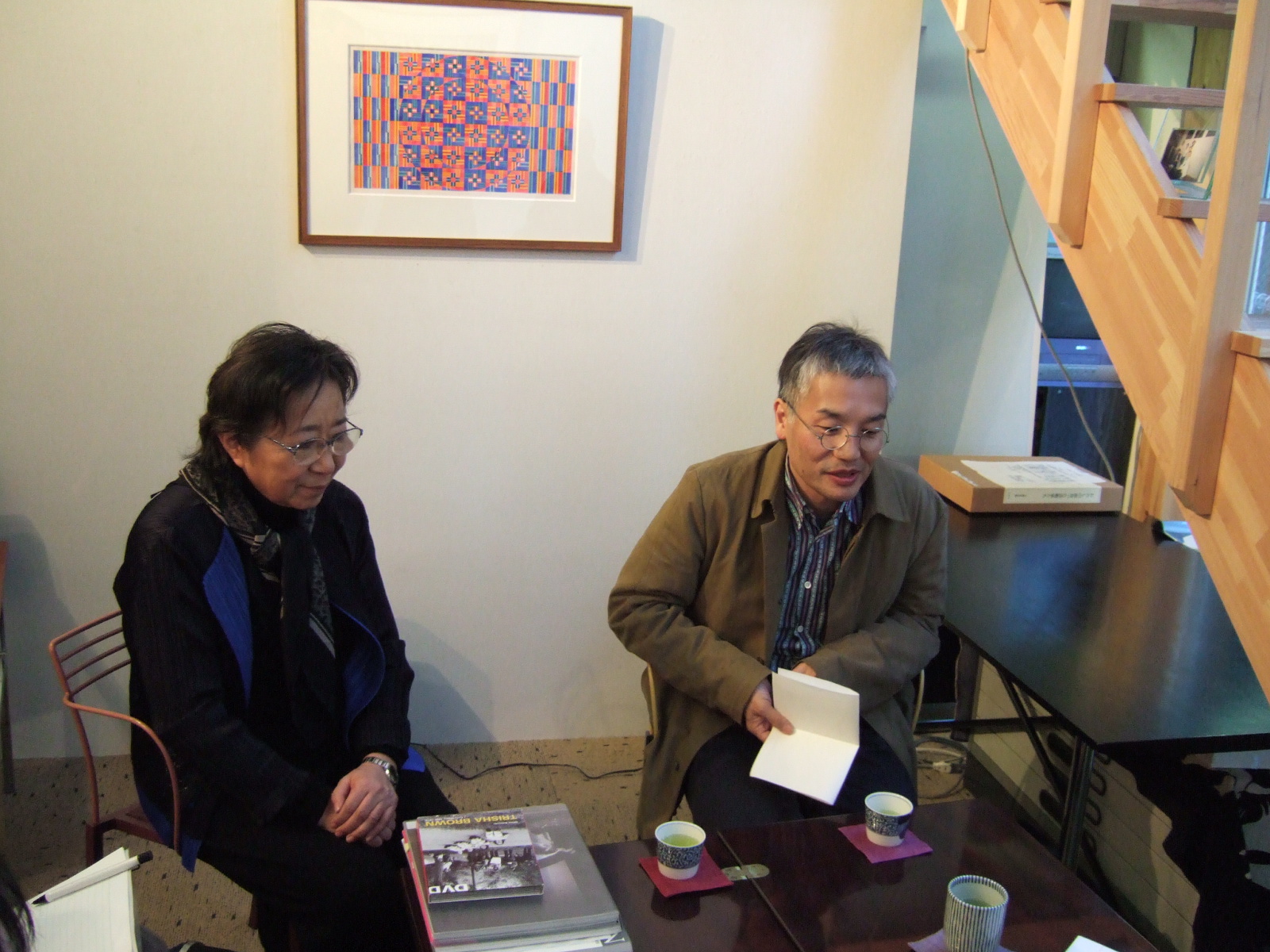 14時に霧の彫刻家中谷芙二子さん、作家の岡崎乾二郎さん、詩人のぱくきょんみさん、岡崎スタッフの木原進さんの4人が来廊され、2006年の3月24日~3月26日に彩の国さいたま芸術劇場「TRISHA BROWN DANCE COMPANY」公演のため来日されるトリシャ・ブラウンさんのことで打ち合わせを行った。トリシャ・ブラウンは、ポストモダン時代に登場した世界的に最も評価の高い振付家で、振付の限界に挑みそれまでのモダン・ダンスの歴史を大きく変えた方。また、踊りながらアートを描いたり、右足で左足を、左足で右足を描いたりするらしい。モダン・ダンスの歴史に果たしている役割の大きさに比べて日本での知名度は低く、中谷先生と岡崎先生たちは3月の来日に合わせて、展覧会ができないかと考えているようだ。DVDでトリシャ・ブラウンのダンスを観させていただき、それぞれアイデアを出して話は盛り上がった。綿貫さんも、先日のジョナス・メカスさんの例や、『版画掌誌』や磯崎新連刊画文集『百二十の見えない都市』、『栖十二』などを見せて、作家の支援について様々な方法があることを提案していった。来週の頭に提案をまとめたメモを送るということで17時頃に打ち合わせは終わった。