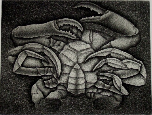 ◆作品のワンポイント/被爆体験をもとに細密極まる鉛筆画で石を描き続けていた「とのしき」という珍しい作家の名前を覚えている人はいるだろうか。久保貞次郎の勧めもあって鉛筆をニードルに持ち替えて、銅版作品でもカニや貝やトンボなどの小さな生き物を細密な作品に描いた。いずれ再評価されるに違いない。