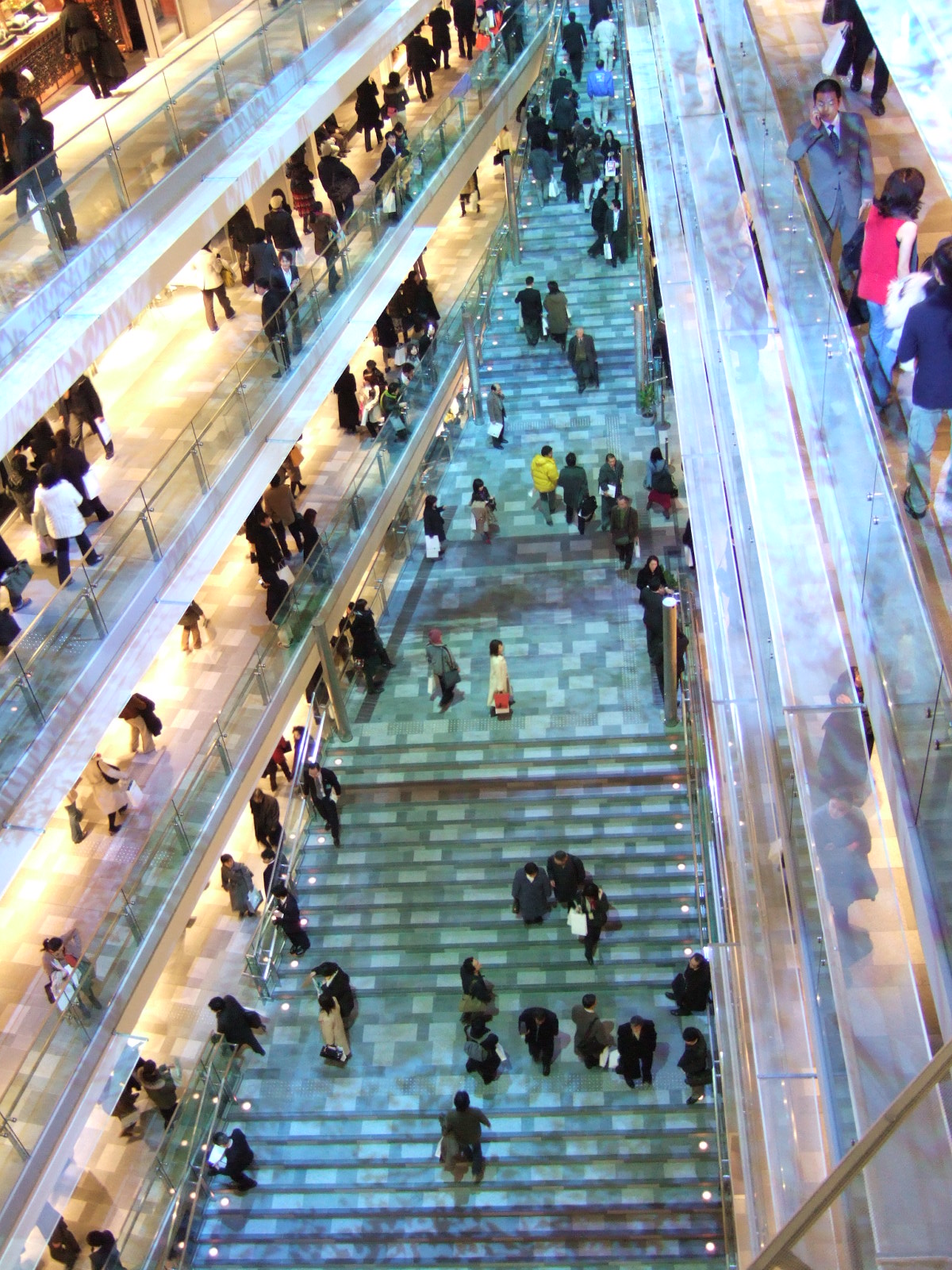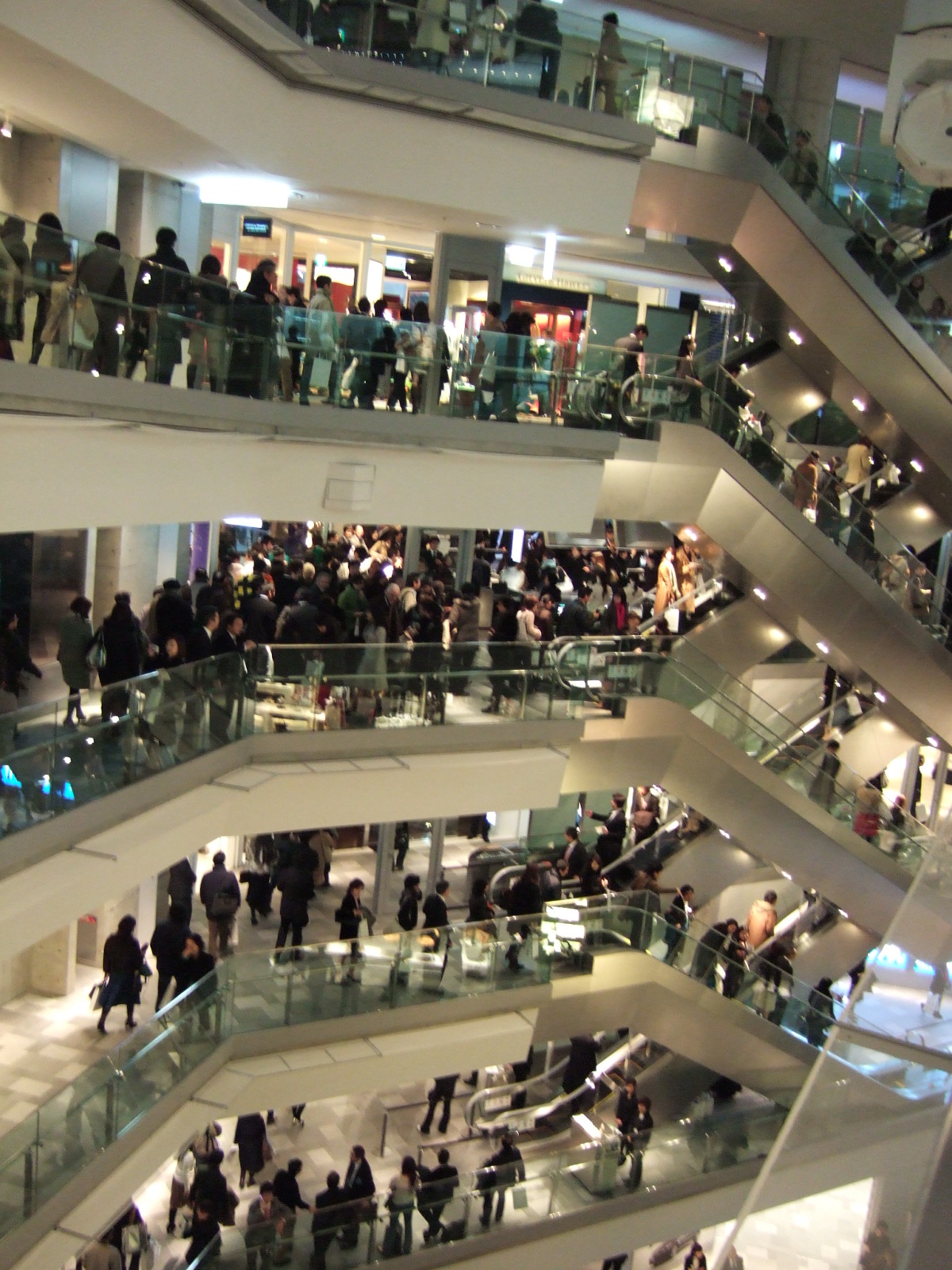 表参道ヒルズに入ると、空間が広いことを知り、まずどこから攻めていけばいいのか迷った。とりあえず2階へ向かい上から全体を見渡すと、そこはファサードからは全く想像のつかない巨大な豪華客船を想わせる大空間だった。地下3階から地上3階まで清々しいほどの吹き抜けで、地下3階から始まる大階段には、穏やかな波のような、風に揺すられているケヤキ並木の影のような映像が映し出され、演出も施されていた。表参道の高低差と表参道ヒルズのスロープが上手い具合にスパイラル状になっており、収容されているショップはまるで同潤会アパートの部屋番号のように「M114」・・・と振られている。コンクリート打ちっぱなしは決して出しゃばりな印象を与えないため、個々のショップが確立されて見える。色々な所に目を向けるとコンクリート打ちっぱなしの丸い柱など安藤忠雄さんが得意とするあのコンクリート打ちっぱなしを見ることができ、嬉しくなる。