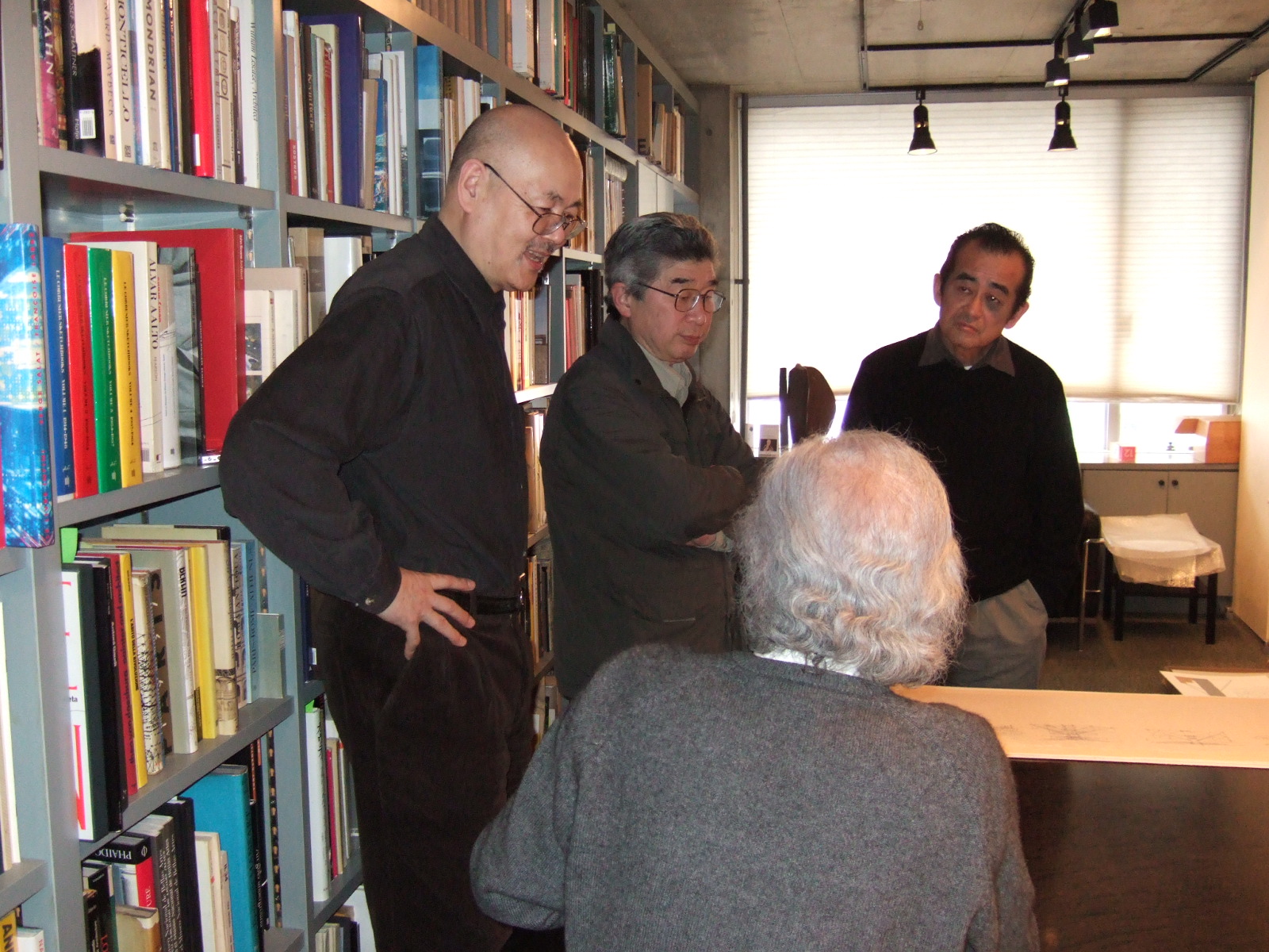 左から磯崎新先生、植田実先生、アトリエスタッフの平田麻里子(長田)さん、綿貫不二夫