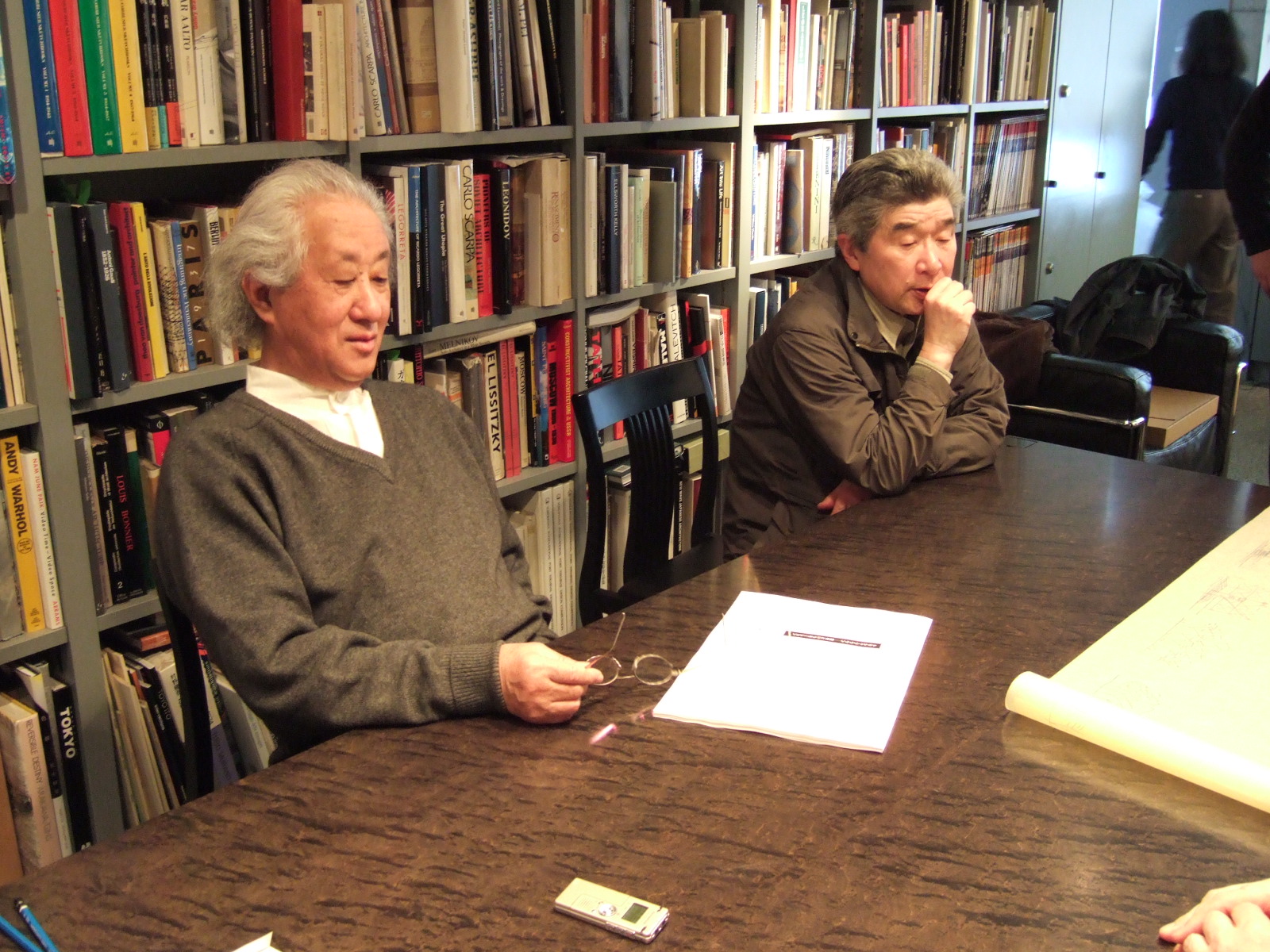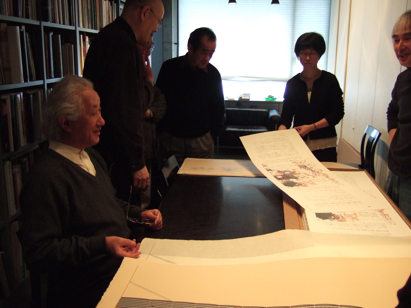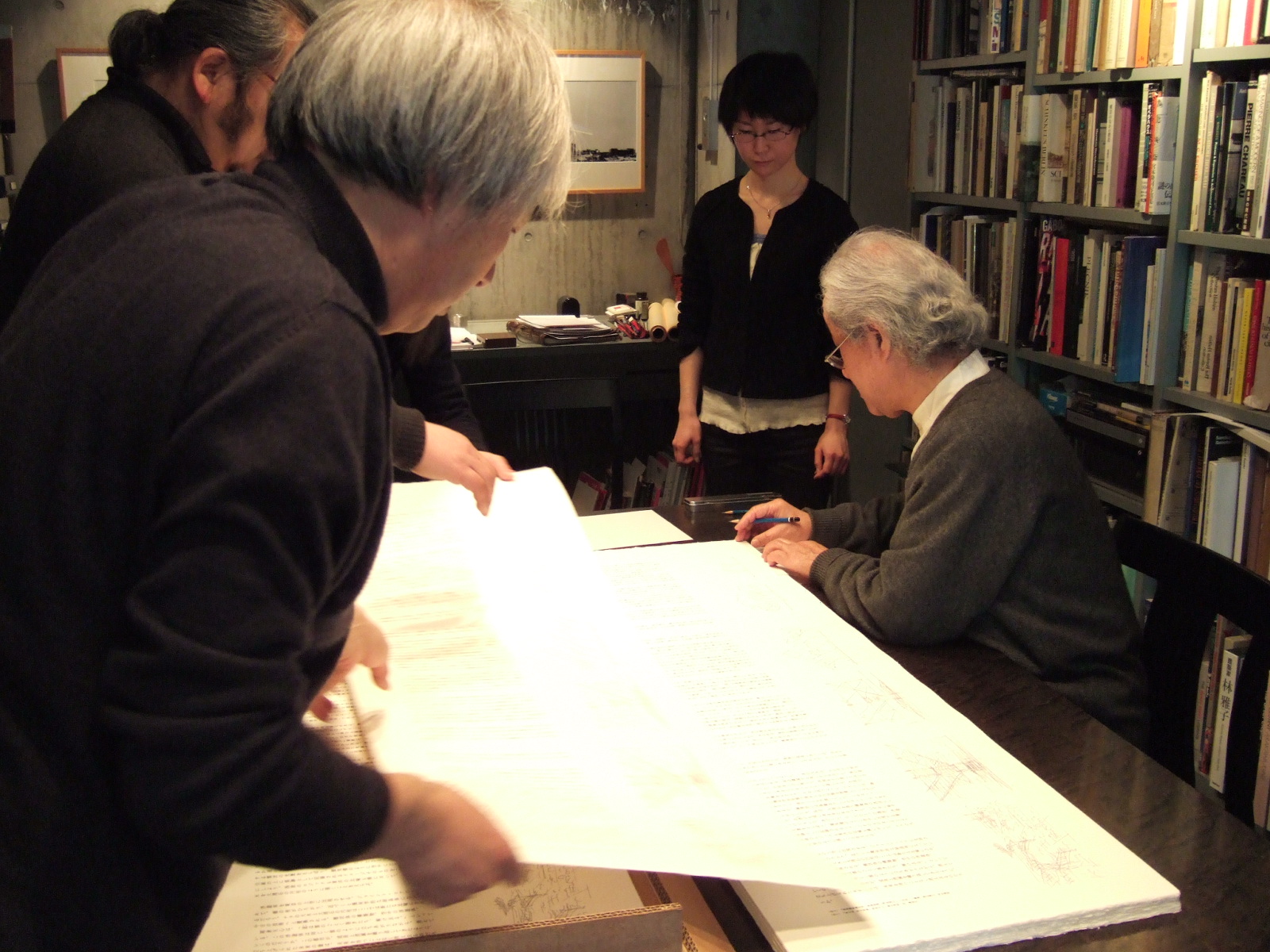 綿貫さんと私が着いたときは、磯崎新先生は打ち合わせ中のようだった。あれ?石山修武さんの声がする!!福岡のオリンピックの打ち合わせをやっていたのだ。うゎ~すごく刺激的。先日ニュースを観ていると、福岡オリンピックにあたっての映像で磯崎新先生が出ていた。私、テレビの前で正座して拍手していました。シルクスクリーン刷り師の石田了一さん、助手の大谷さん、銅版画刷り師の白井四子男さん、綿貫さん、私は一番奥の磯崎先生のデスクがある部屋に通された。磯崎先生は福岡オリンピックの打ち合わせを一時中断し、シルクスクリーンにサインを戴いた。200枚近いシルクスクリーンに黙々とサインしていた。植田実先生も登場し、石田了一さんが刷ったシルクスクリーンをいいね~と囲んでいた。石田さんは別刷りといって和紙やらトレペにも刷っており、磯崎新先生が石山修武先生を呼んで見せた。綿貫さんは、磯崎先生と石山先生に福岡オリンピックの話を根掘り葉掘り聞き出していた。磯崎新先生、植田実先生、石山修武先生、綿貫不二夫さん・・・絵になる!!と、写真に収めてみました。磯崎先生に『トリシャ・ブラウン――思考というモーション』のゲラを渡し、ICレコーダを前に「コメントください。」とせがんだ。トリシャ・ブラウンについて話して戴き、コメントを戴きました。『トリシャ・ブラウン――思考というモーション』を購入して戴いた方だけに、特典としてこのコメントを配信します。まだまだ有名人のコメントもあります。