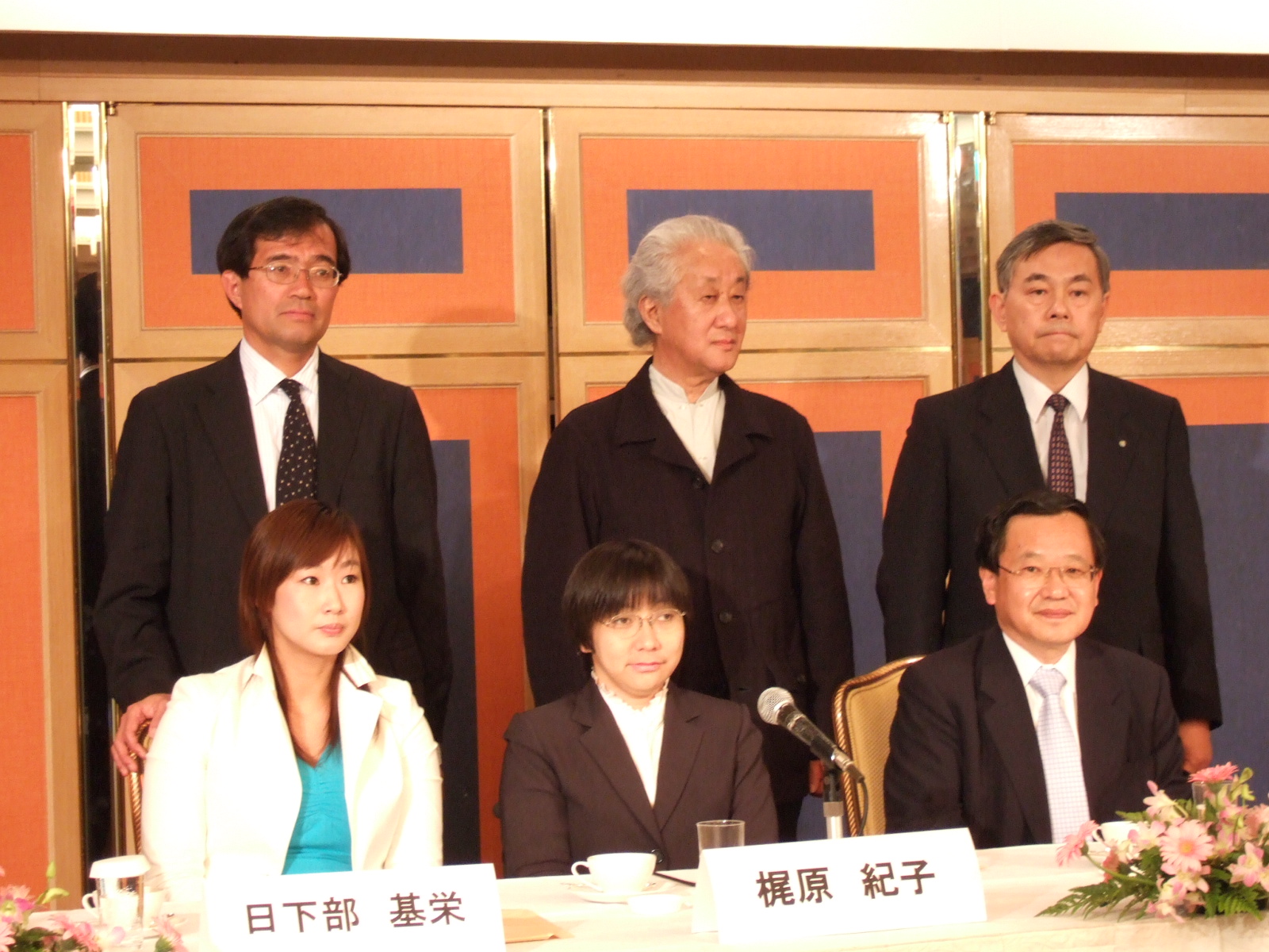 今日は15時からホテルニューオータニで「福岡オリンピック・パラリンピック招致スポーツ記者説明会」がありました。4月25日にあったのは外国記者向けの開催計画記者発表で、今回はスポーツや新聞等に向けた予算などの詳細をつめた内容でした。麗の間というなんとも古風な名前の会場で、ビデオカメラは3台くらいに新聞記者やテレビ局の報道陣が来ていたが、思っていたより少ない数だった。綿貫さんが「あんまり前もなぁ~」と言うので、少し遠慮して前から3列目の磯崎新先生の座席側に座ると、ウエイターがコーヒーとミルクを注いでくれた。開催定刻1分前に登壇者が来場し、磯崎先生はオフホワイトのスタンドカラーに黒いスーツを着ていた。右から磯崎新先生、福岡市オリンピック招致準備事務局長、福岡市財政局長、福岡・九州オリンピック招致アドバイザーの梶原紀子さん(アトランタ・アテネ・パラリンピック金メダリスト)、日下部基栄さん(シドニー・オリンピック柔道女子57キロ級銅メダリス
