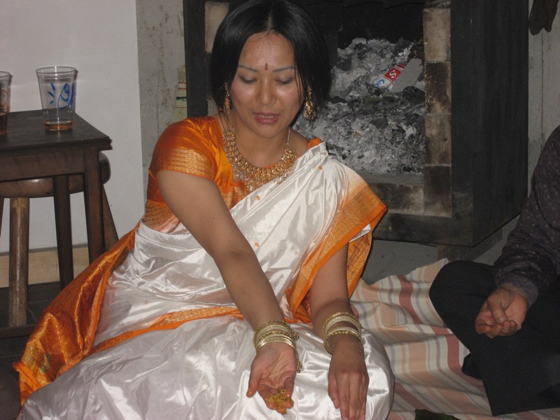 オレンジと白色のサリーを纏ったインド・料理研究家の香取薫先生が、外でスパイスを炒り・潰す姿を見せてくれるというので、皆さんでデッキに出た。そこで、サリーで変身して見せてくれた。料理をする時、子供を抱く時、寒い時、目上の人が来た時、砂漠で顔を覆う時・・・肩に掛けているサリーを前に持ってきたり、頭に掛けたりすることで用途が変わるそうです。
