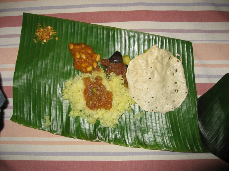 数種類の粒の状態のスパイスを火で炙ると香りがほのかにしてきた。唐辛子は使わないそうです。そのピーク時に火から降ろし、重い石臼の上に載せ、石棒を持つ手首を上下に力強く動かしながらそれを潰します。(普段は床でこの作業を行なうそう)その際、香取先生の両手首を飾るブレスレットの鈴音がチリンチリンと鳴り、鈴音とスパイスの香りが夜空に舞い上がる。インドの人はこういう風に音を鳴らしながら料理をするそうだ。情熱的だ・・・。スパイスも粉々になり、試食をするため部屋に入り足を崩して床に座った。床に青々としたバナナの葉っぱが置かれた。これがお皿。このお皿に少し黄い色のついたお米が載り、普段はマトンを使用するそうだが、今日は豚肉入りのカレーと(インドでマトンはヤギを指すそう)、トーガンのカレー、豆のカレー、スープカレー、野菜の入ったヨーグルトが次々お米にかけてくれた。また、スナックのようなパリパリするものやベビースタラーメンみたいなものやスパイスも添えられた。香取先生に習って、象の鼻を真似るときの手をして、米とカレーを混ぜながら人差し指と中指と親指で掴み、親指でそれを弾くように口の中へ放り込む。指先から第二間接まで汚して食べるそうだが、もう私は手のひらにさしかかるくらいまでベタベタ。ナフキンで手を拭きたくてムズムズした。でもどのカレーも辛くなく、さっぱりしていて味が口の中で変化し、美味しい。ヨーグルトも悪くはないと思った。また、インドでは食事中に水を飲まないと言います。水を飲むと薬膳の働きをするスパイスの効き目を薄れさせてしまうそうだ。私もインド人になったつもりで最後まで手で食べ、水を飲まなかった。最後は、南インドに行った際の写真をパワーポイントで見た。お金持ちのリゾート地からバザールまでのいろんなインドを見た。南に行けば行くほど派手になるそうだ。今日、初めてインドに行ってみたいと思った。
