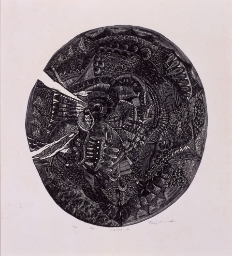 同じ木版画なのに、板目木版と木口木版とはまったく異なる世界を出現させる。板目木版の場合、正目を使う。自然木でいえば、もっとも成長の早い伸びしろの大きな部分が正目である。正目はともかくのびのびしている。木の状態では垂直になっているものを版画では水平において使う。一方、木口木版の場合、もっとも成長が遅く、伸びしろのないのが木口である。したがって硬い。木のなかの「おしん面」なのである。ともかく苦労している。立ったままの木を水平にカットして、そのまま版画の面として使うのが木口木版である。だから自然の摂理から考えると倒錯がない。もっとも自然な状態なのである。日和崎は特に椿を版木に使った。木口で切断された椿には時に割れもあったが、その割れも作品の一部として使う度量が日和崎にはあったし、黄楊ほどには硬くない椿の切断面をきれいに金属でいえば鏡面に磨きあげる作業を惜しまなかった。木口が苦労している「おしん面」であるなら、これを使う版画家も下準備に徹底して苦労する。この工程なくして木口木版作品の深さはでない。この磨きあげた面に黒いインクをのせて刷ると漆黒の闇がプリントされる。それは深い深い闇であるが、日和崎の闇は、私にとって果てしない海である。
