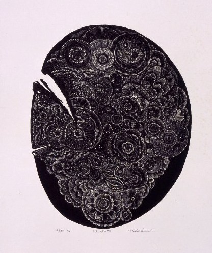 銅版画つまりエングレービングの場合、光る金属面をさらに刃物で削る。すると、さらに輝く面が光をはじく。目に痛いほどである。だが、これを刷る場合、インクは輝く溝に入り込み、黒い刻み線としてプリントされる。左右の逆転とともにネガとポジの転換が生じる。木口木版の場合、左右逆転はあってもポジはポジのままである。硬くそして滑らかに磨かれた面に黒い海を孕ませ、刻んだ一本一本の線が光となって輝き始める。聖書には「はじめに光あれ」という言葉があり、世界のはじまりの前に光が生まれたということであるが、光がうまれるためには闇が必要であり、日和崎はまさにこの世界の生成を小さな木口という版木の上に形成していった。そして、その小さな宇宙は無音の海であり、海には生命のはじまりや生命の終わりが潜んでいる。日和崎は彼の代表作を『KALPA』と名付けている。KALPAとは古代インドの時間の永遠さを表す言葉。天女が百年に一度降りてきて羽衣でこする、これを繰り返して7km四方の石がなくなる時間というのだから無限ということだろう。生命の誕生からはじまる命をつなぐ無限の時間を日和崎は感じていたのかもしれないと思った。