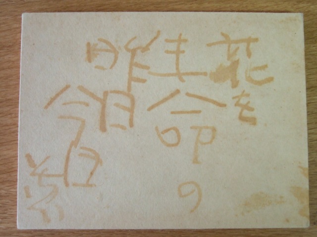 2006.8.5 画廊亭主の徒然なる日々 即興詩人・日和崎尊夫~画廊亭主の徒然なる日々 日和崎尊夫展も本日が最終日。 たくさんの日和崎ファンが来廊されましたが、特に生前、作家と親交のあった方々の思い出話は私たちにとって何よりの嬉しい贈り物でした。 このはがきサイズの作品、何だと思いますか? コレクターだったOさんが、おすし屋さんで会食した折、日和崎尊夫先生が割り箸とお醤油でさっと書いたもの。 Oさんはそれを持ち帰り、パネルにはって大切にしてきたものです。 お醤油とはねえ、詩人日和崎尊夫の面目躍如です。