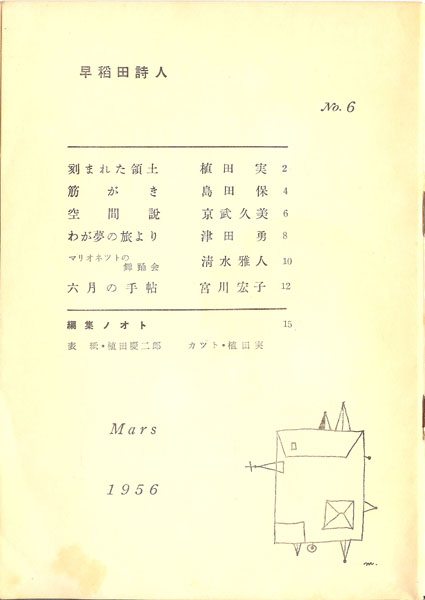 私の作品はこの第6号の巻頭に掲げられているが、多分これ1回限りで、まもなく早稲田詩人会を退部したのだと思う。前に書いたように、それまで買い集めていた数多くの詩集を処分し、詩を書くこと自体をやめてしまったからである。その理由はのちに話すことになるだろうが、6号の目次欄を見ると、自分でカットを描いたりして、本文構成は先輩に委ねているものの印刷物としての体裁には生意気にもけっこう口出ししていたのを今更に思い出す。